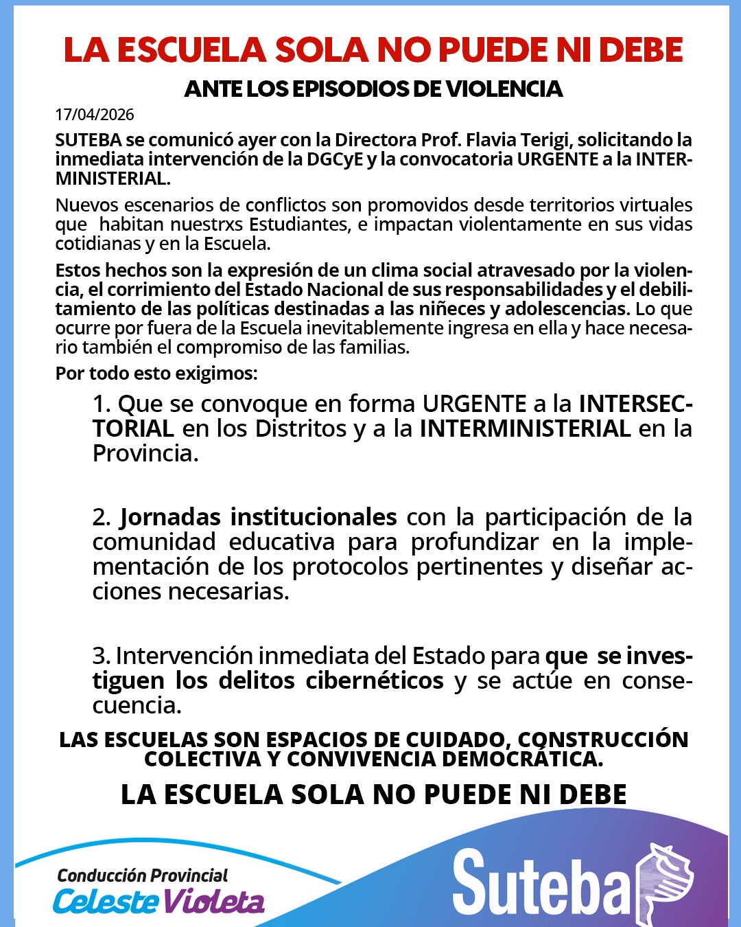 Ante la amenazas y hechos de violencia que se vienen registrando en distintas Escuelas de la Provincia, el SUTEBA se comunicó ayer con la Directora Prof. Flavia Terigi, solicitando la inmediata intervención de la DGCyE y la convocatoria URGENTE a la INTERMINISTERIAL.
