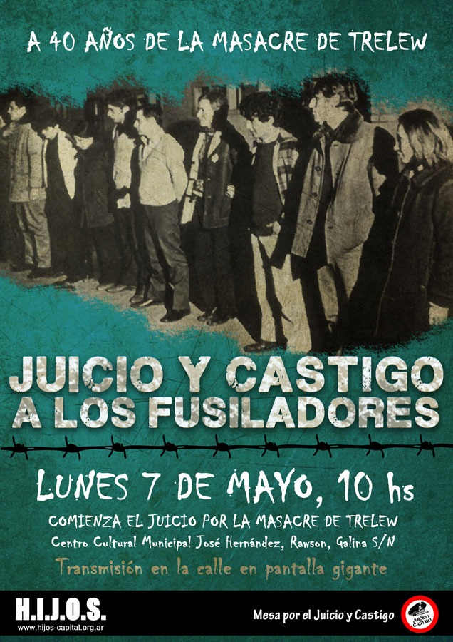 40 años de la Masacre de Trelew, el 7/5 empieza el juicio a los fusiladores de los compañeros en 1972. El 22/8/1972 fueron fusilados 19 presos políticos, militantes de las organizaciones PRT-ERP, FAR y Montoneros.
