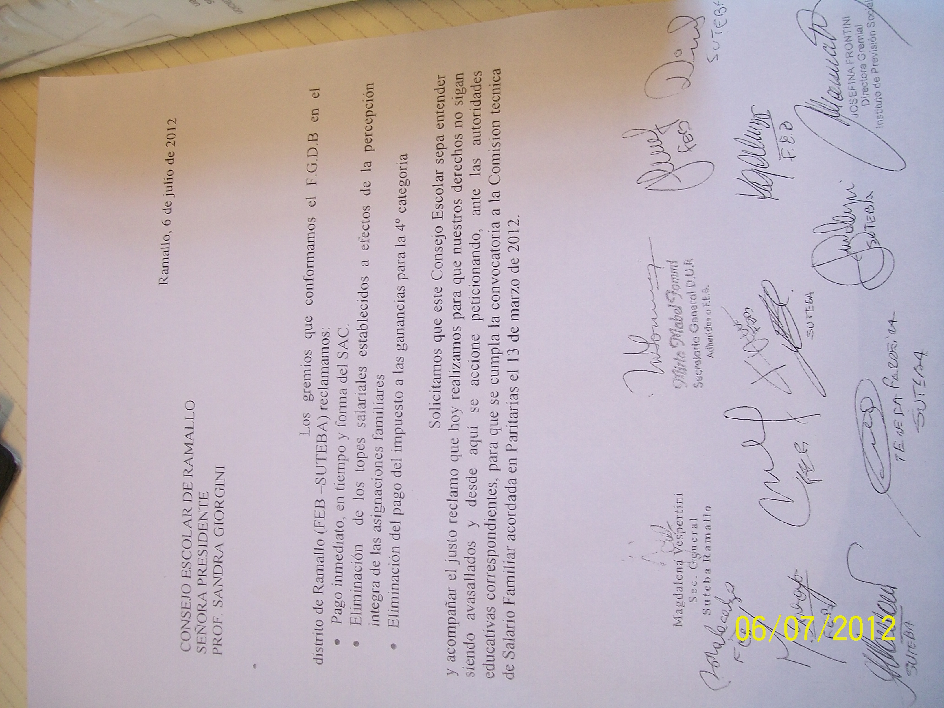 05/07/12 Durante el jueves 5 de julio, se hizo notar en los distritos del interior de la provincia la participación activa de los docentes en reclamo del medio aguinaldo.