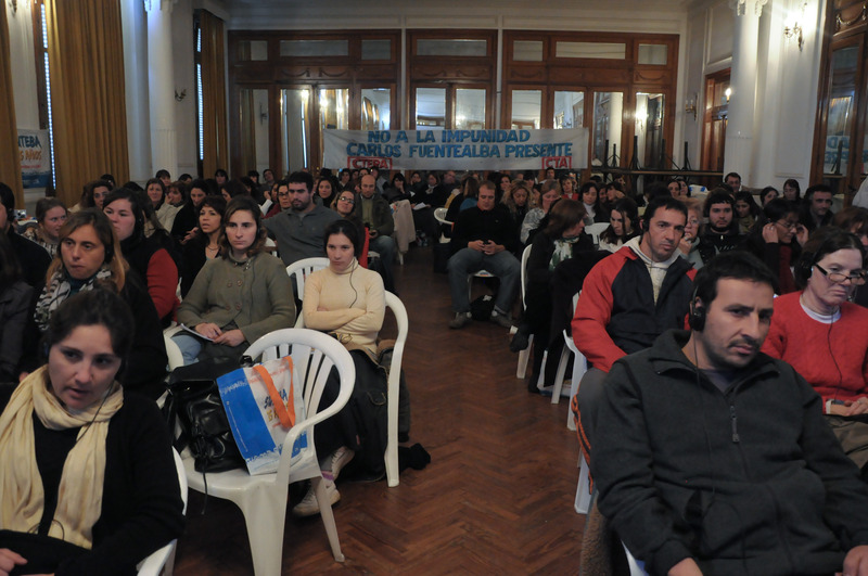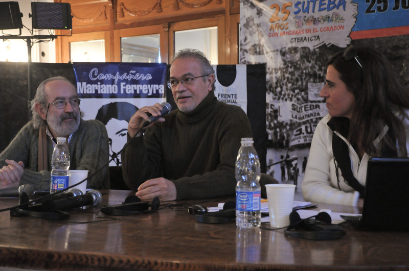 El primero en hablar fue Marcelo Zarlenga quien enfatizó: “Cuando hablamos de trabajo docente no podemos hacerlo sino lo implicamos desde lo político y lo pedagógico. Si por trabajo entendemos a toda actividad humana que transforma materia e ideas, entonces nosotros nos constituimos no sólo como trabajadores intelectuales o de la cultura, también nos constituimos en trabajadores que ponemos tener dos caminos: una mirada reproductiva o una mirada de transformación”. También dijo: “Debemos recuperar los conocimientos que produce el trabajo”.