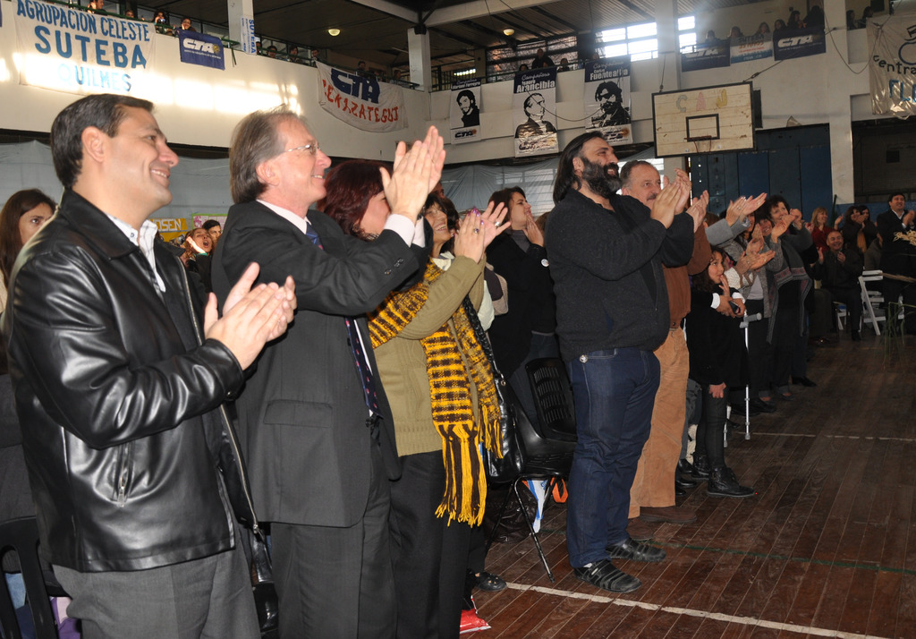 Acto seguido, tomó la palabra la compañera Cecilia Martinez, quien relacionó al SUTEBA con el rol de los pueblos a lo largo de la historia: “Los pueblos recorren y escriben su propia historia y nosotros lo que tratamos es ser protagonistas en ese camino”. Además, contó algunas anécdotas del SUTEBA y de su nacimiento. En 1976 con el golpe militar, las dos docentes que quedaban en el local de Morón tuvieron que cerrar porque no les renovaban el contrato (una de esas docentes era Cecilia Martinez), entonces empezaron a repartir por distintos lugares los muebles del local. Un escritorio lo llevaron a la Fraternidad (Sindicato de los Ferroviarios) y le pidieron que lo guardaran: “Estuvimos casi 7 años sin local, cuando logramos, en el ’83, alquilar un localcito, empezamos a rescatar los muebles. Fuimos a buscar el escritorio a la Fraternidad pensando que ya no iban a tenerlo. Cuando llegamos le contamos a un compañero que había ahí quienes éramos y que hacía 7 años habíamos dejado un escritorio allí, a lo que el compañero inmediatamente contestó: ‘¿El escritorio de los maestros? Si, lo tenemos guardado’. Entonces, nos dimos cuenta que no nos habíamos equivocado, que ese era el camino que queríamos seguir, junto a los laburantes”.