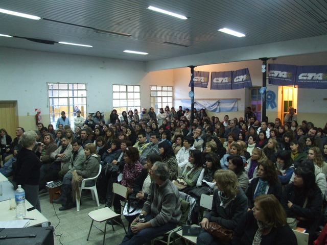 El último en exponer fue Héctor Gonzalez: “Históricamente nuestro trabajo estuvo muy marcado por otras miradas, construidas en los escritorios de los funcionarios, en los escritorios de las academias, incluso en ciertos medios hegemónicos o en organizaciones empresariales u organizaciones que están financiadas por los sectores de poder. Por eso, la propuesta de CTERA y SUTEBA fue construir una mirada nuestra sobre nuestro trabajo, para evitar quedar atrapado o colonizado por esas otras miradas.” Para dar un ejemplo de esto que decía, Gonzalez habló de las pruebas PISA: “Aferrarse a las pruebas PISA para referirse a la mala calidad, es para tratar de instalar y legitimar la idea de que nuestro trabajo (el trabajo docente) es fácil y solamente evaluable a través de los resultados de nuestros alumnos. En esta idea, subyace otra idea más sutil que es la idea de reducir la educación a la tarea que realiza el docente con el alumno. Esta reducción de la educación tiene importantes consecuencias, porque invisibiliza, en primer lugar, todo nuestro proceso de trabajo que realizamos cuando no estamos frente a los alumnos (nuestro trabajo tiene un proceso antes y después de estar con los alumnos). Como está invisibilizado no se nos lo reconoce y no se nos lo paga. Además al reducir esa relación, se invisibiliza también todas las otras relaciones de trabajo que tenemos que hacer (trabajo con los otros docentes, con los padres, etc.) para que efectivamente esa porción de trabajo que hacemos con los alumnos se puedan realizar. La tercera, es que todas las responsabilidades sobre lo que suceda o no, en esa relación queda circunscripta a los integrantes de esa relación. Entonces si no hay buena enseñanza en el aula, la responsabilidad es de los alumnos o del mal desempeño del docente y quedan invisibilizadas todas las otras responsabilidades que están incidiendo en lo que se produce ahí: las políticas educativas, las gestiones, los estamentos del sistema educativo, etc.” Y planteó algunas posibles soluciones: “Para que la escuela pueda llevar adelante un trabajo colectivo de tal complejidad, no basta con el hacer ni la voluntad de los que trabajamos en ellas. Necesita muchas condiciones, pero una imprescindible es tener de un conocimiento lo más específico y preciso posible acerca de esos sujetos concretos con los cuales nosotros cotidianamente trabajamos. Un conocimiento acerca de esas situaciones áulicas. Ese conocimiento necesita una organización escolar que garantice espacios, tiempos y recursos para que los docentes se puedan juntar a debatir, intercambiar y compartir. Necesitamos que la jornada laboral contemple tiempos de trabajo sin los alumnos y abarque el trabajo colectivo.” Finalmente, se despidió: “Debemos entrar al aula convencidos de que es un espacio de producción de conocimiento y de producción cultural. El aula no es el lugar donde se bajan contenidos. Es el lugar donde debemos generar procesos de creación de contenidos.”