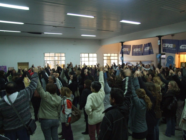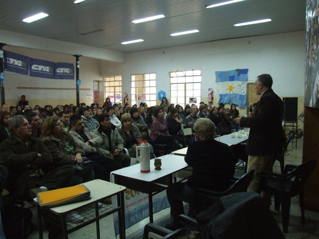 Victorio aportó al debate desde sus experiencias de vida. Dijo que la escuela pública tiene la misma edad que el movimiento sindical en la Argentina y unos y otros han tenido mucho que ver con lo que ha sucedido en nuestra historia y, fundamentalmente, con lo que ha sucedido en el mundo de los trabajadores. Luego, señaló: “El valor de lo que hemos pasado (cárceles torturas exilios) no es el sufrimiento, sino que el valor es la resistencia. Si de resistencia se trata, nosotros tenemos muchísimos ejemplos para mostrar en el conjunto de movimiento social de nuestro país, como por ejemplo Madres y Abuelas, que hicieron cosas que en otros lados no se hicieron, ni se hacen: aparición de 100 nietos, juicio a los genocidas, sentencias a cárcel común, etc.” Habló de los ’90 y dijo: “Este país había sido tomado por el menemismo con un 7% de desocupación y en su mismo período subió al 23%. Y luego, un tercio de la población excluida.” Al mismo tiempo, lo relacionó con la actualidad europea: “Hoy Europa se ha “menemizado”, hoy avanzan sobre los derechos de los trabajadores de la misma forma que avanzaron sobre los nuestros. Esto quiere decir que es algo intrínseco en el sistema capitalista. Y los sindicatos siguen siendo la herramienta principal que tienen los trabajadores a estas políticas.” Celebró el encuentro y concluyó: “Hay que aprovechar a fondo estos espacios de reflexión, ojalá todos los sindicatos en la Argentina tuvieran la posibilidad de reunir a sus bases para hacer estos debates que tienen que ver con la formación, pero que también tienen que ver con la creación de consciencia colectiva de ustedes, los trabajadores de la educación. Para que se involucren cada vez más con su destino colectivo.”