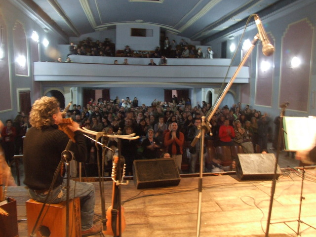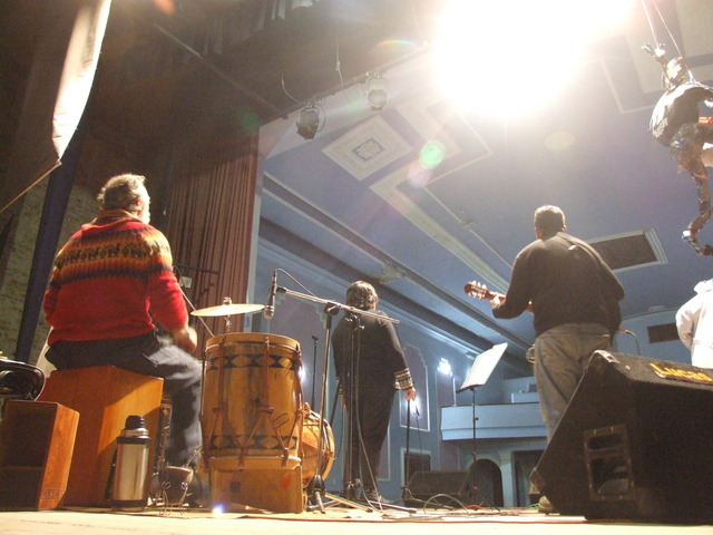 Al entrar al teatro, sobre el escenario se estaba preparando el grupo de percusión de “Patios Abiertos”. Un programa provincial que permite que los chicos utilicen la escuela los sábados para realizar actividades deportivas, artísticas y recreativas. Funciona en la Escuela Nº 2 “Islas Malvinas”.