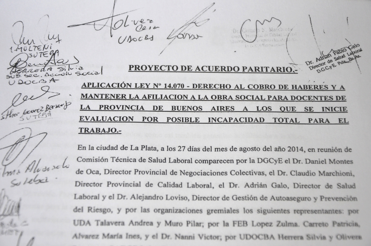 El miércoles 27 se firmó con consenso unánime un nuevo Proyecto de Acuerdo Paritario de la Comisión Técnica de Salud Laboral. El mismo garantiza el cobro íntegro de haberes y, por ende, la continuidad de la afiliación a la Obra Social a todos los docentes que inicien el trámite jubilatorio por incapacidad durante todo el proceso y hasta la culminación del mismo.