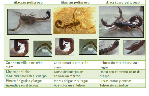 Sobre todo se debe prestar atención a las pinzas anteriores que cuando son largas y delgadas anuncian variedades peligrosas. También indica su peligrosidad la presencia de un apéndice en el telson o prolongación posterior. (VER FOTO)