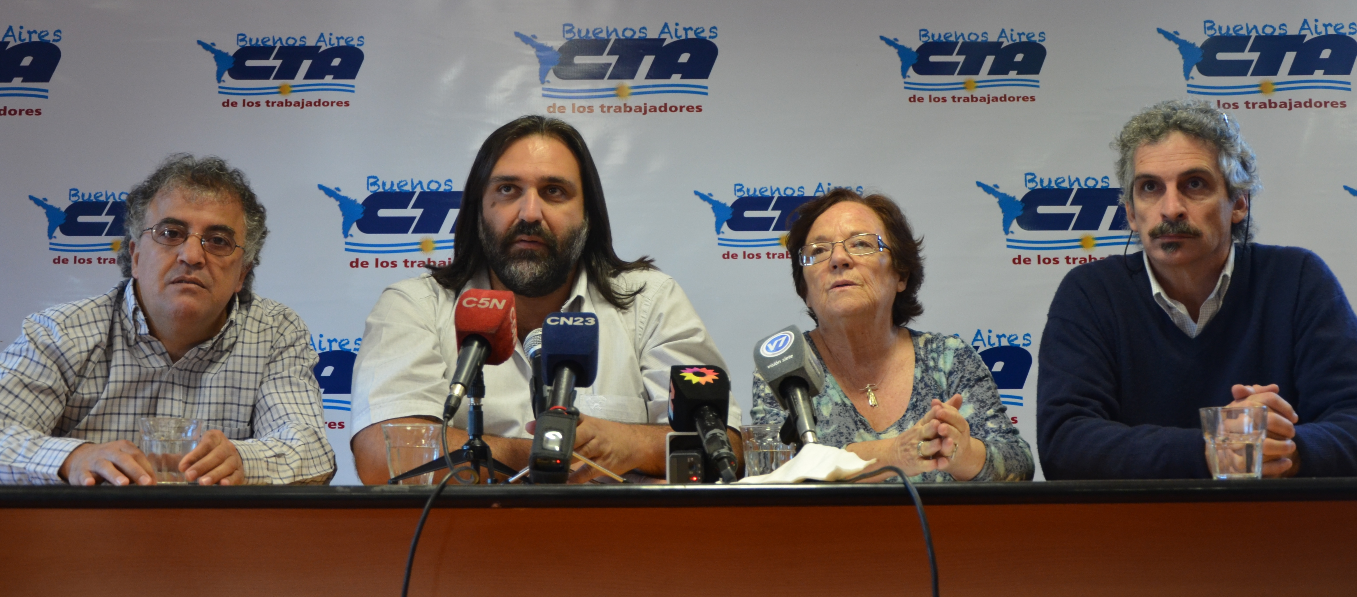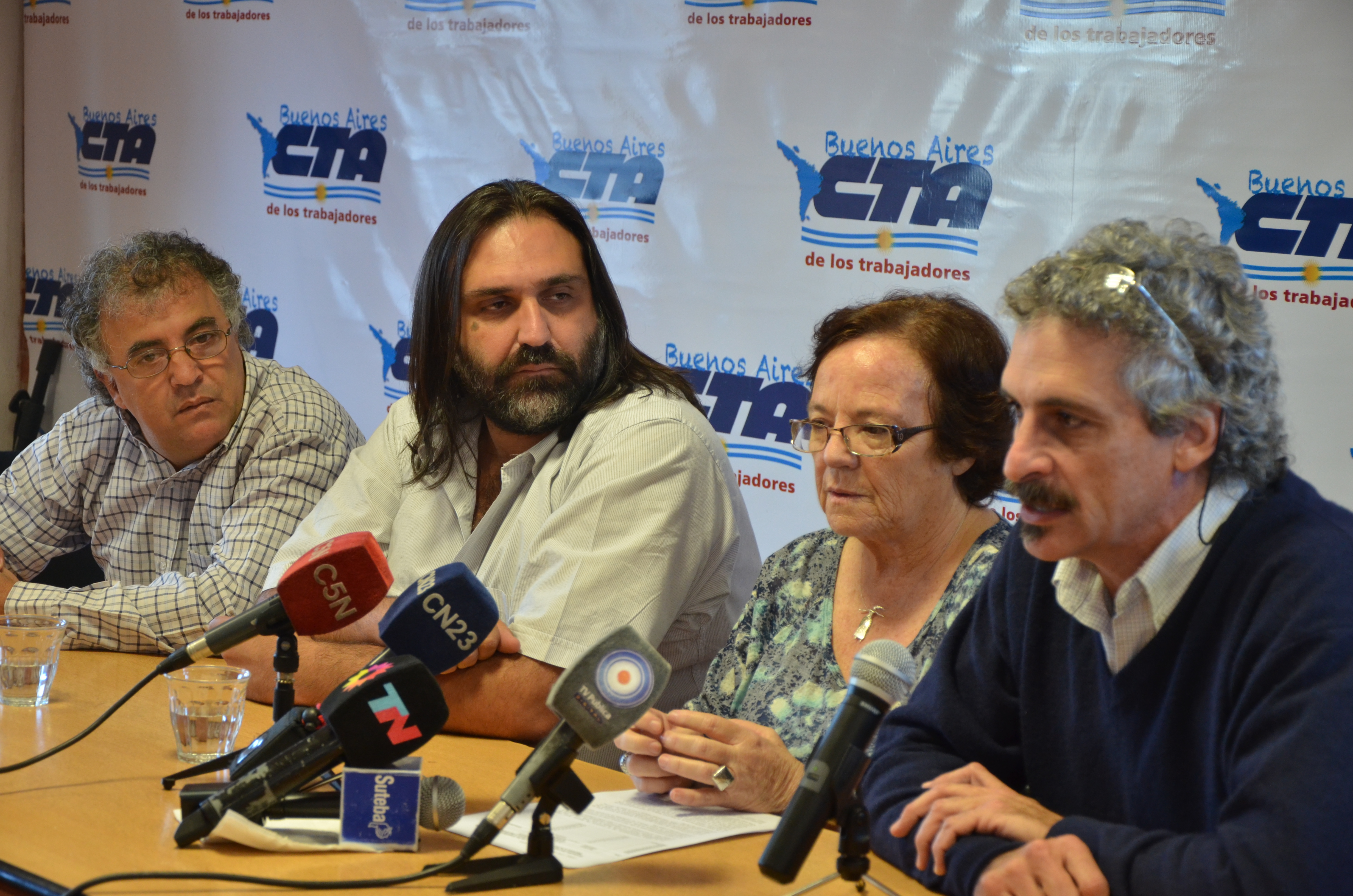 04/03/2013 El Secretario General de SUTEBA y CTA Buenos Aires, Roberto Baradel, brindó una conferencia de prensa acompañado por la Secretaria General de CTERA, Stella Maldonado; el representante de ATE y Secretario Adjunto de CTA Buenos Aires, Fabián “Moncho” Alessandrini; y el representante de la AJB y Secretario Adjunto de CTA Buenos Aires, Daniel Perez Guillén, con respecto al cese de actividades previsto para esta semana y sobre el panorama docente a nivel provincial.