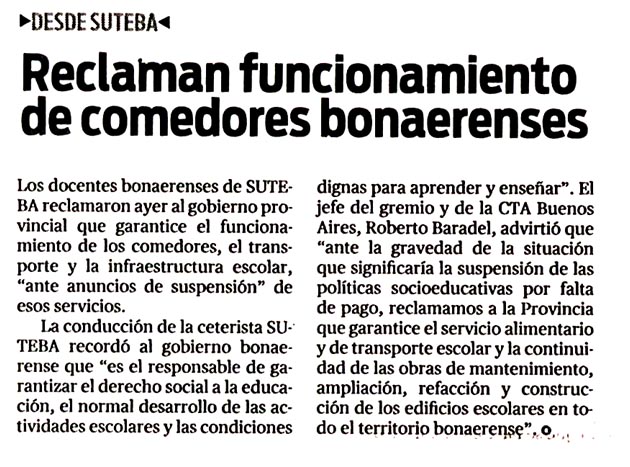 11/09/2012 Los docentes bonaerenses de SUTEBA reclamaron ayer al gobierno provincial que garantice el funcionamiento de los comedores, el transporte y la infraestructura escolar, "ante anuncios de suspensión" de esos servicios.