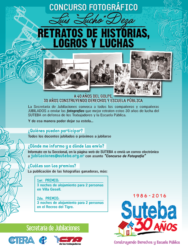 Por los 30 años que cumplirá el SUTEBA en el 2016, la Secretaría de Jubilaciones organizó el Concurso Literario "Stella Maldonado" y el Concurso Fotográfico "Luis "Lucho" Deza", con la premisa que los compañeros jubilados aporten retratos y relatos de historias, logros y luchas que tuvieron lugar a lo largo de la vida de nuestra organización sindical.