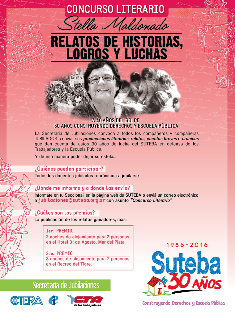 La Secretaría de Jubilaciones convoca a todos los compañeros y compañeras JUBILADOS a enviar sus producciones literarias, relatos, cuentos breves o crónicas que den cuenta de estos 30 años de lucha del SUTEBA en defensa de los Trabajadores y la Escuela Pública.