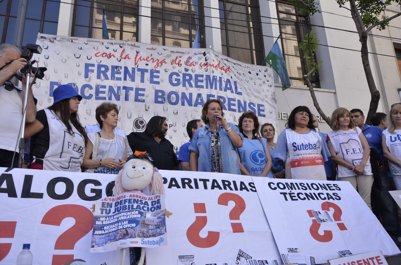 En el día de hoy, el SUTEBA en el marco del Frente Gremial Docente Bonaerense, se concentró frente a la Casa de la Provincia de Buenos Aires para reclamar una urgente convocatoria para discutir salarios, condiciones laborales y un mayor Presupuesto Educativo para 2017.
