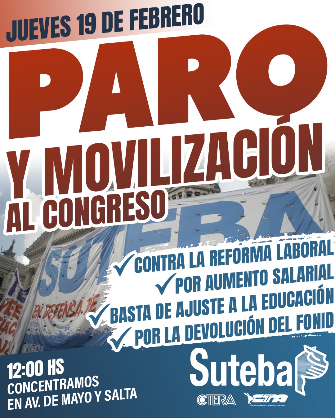 Este miércoles 11 de febrero, el SUTEBA participó activamente del paro y la movilización al Congreso de la Nación en el marco de la jornada nacional de lucha convocada por las dos CTA y la CGT, expresando su firme rechazo a la reforma laboral impulsada por el Gobierno Nacional.