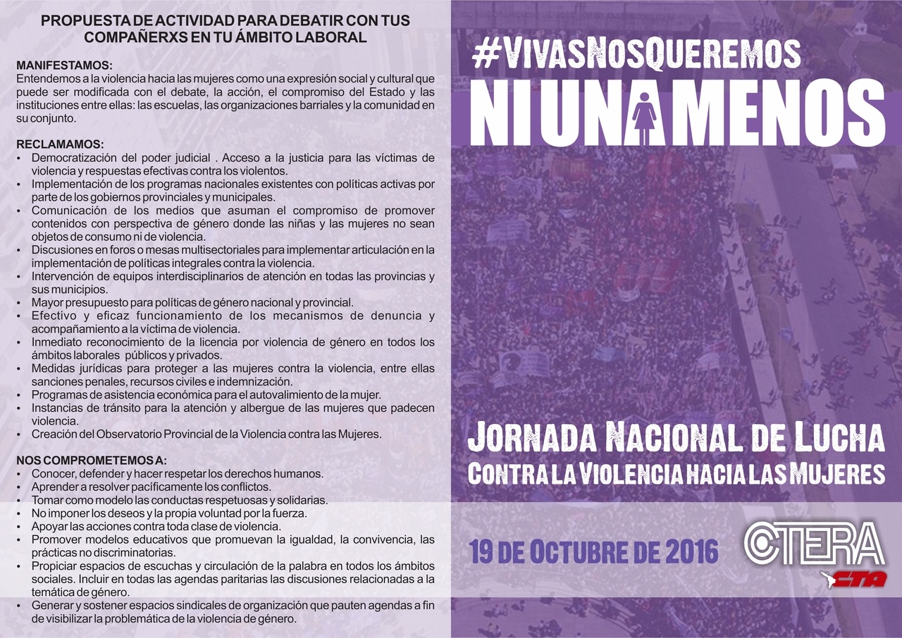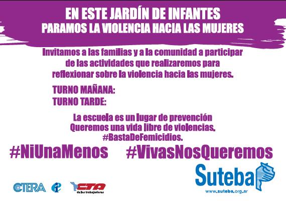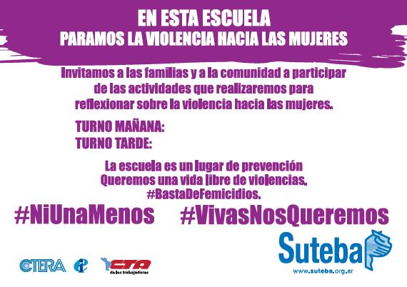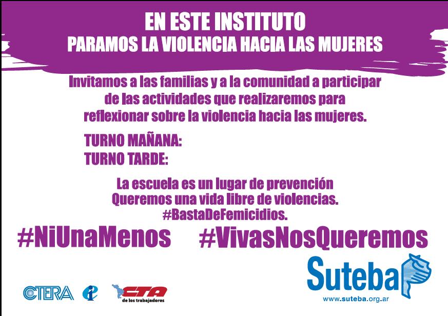 En cada escuela, jardín de infantes o instituto convocamos a un momento de reflexión colectivo acerca de la violencia hacia las mujeres. Para ello proponemos que se realice una convocatoria a las familias en cada turno y realizar una actividad de reflexión. Adjuntamos modelo de convocatoria para las puertas de las escuelas.