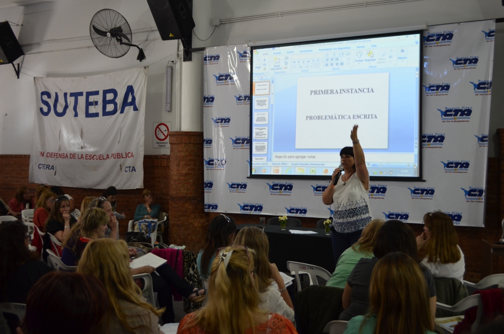 Por la tarde, luego del receso se llevó adelante un taller de escritura y resolución de problemáticas, en función de la primera instancia del concurso que las compañeras están por protagonizar, a cargo de la compañera Haydée Kazieczko del equipo provincial de la Secretaría de Educación del SUTEBA.