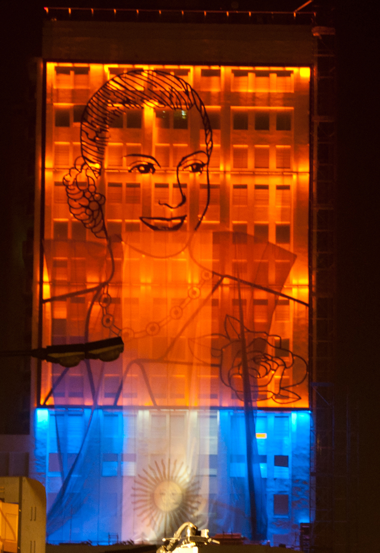 La presidenta Cristina Fernández encabezó la inauguración de una obra realizada en hierro con la imagen de Evita, al cumplirse 59 años de la muerte de la primera dama. Se trata de un retrato gigante que se colocó sobre la fachada sur del Ministerio de Desarrollo Social, ex Ministerio de Obras Públicas. El escenario central del acto estuvo ubicado en la intersección de la avenida 9 de Julio y Venezuela.