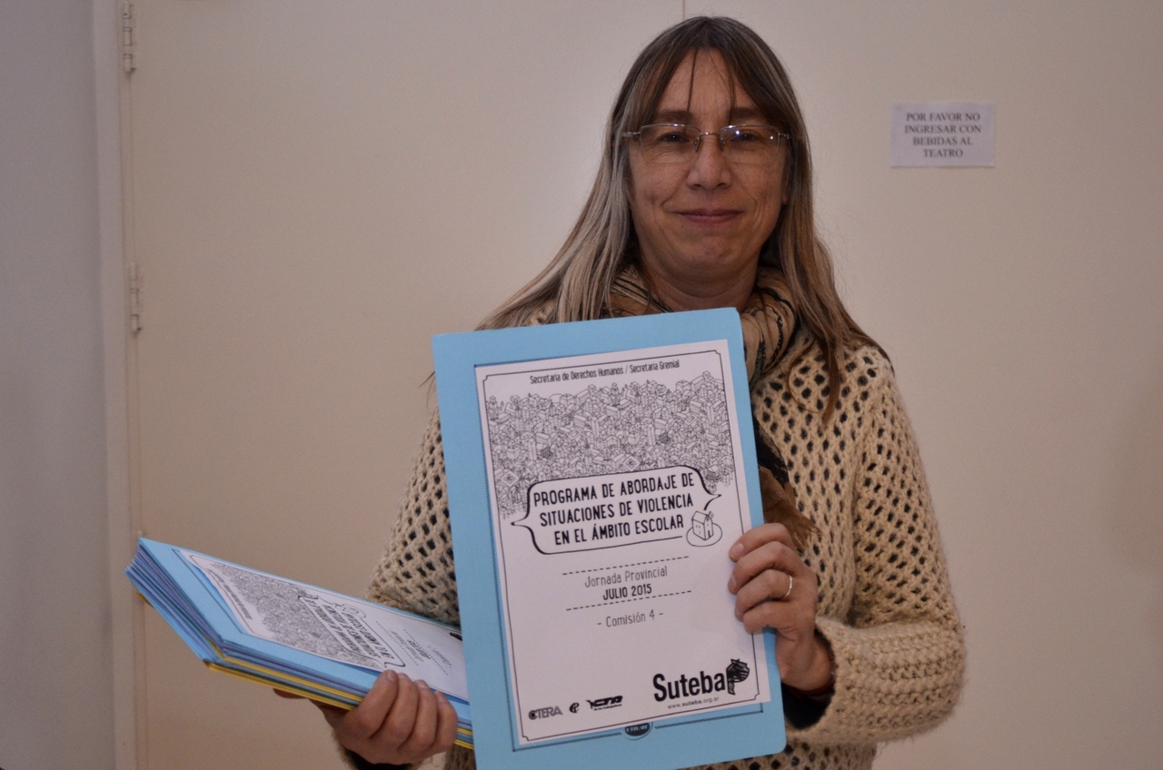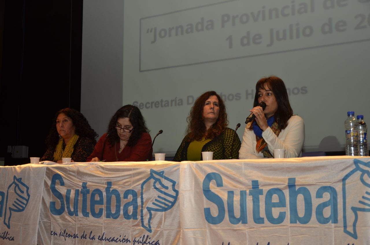 Por su parte la Subsecretaria de DDHH, Patricia Romero Díaz, expuso los lineamientos del trabajo que se realizan en el marco del Programa Provincial de abordajes de situaciones conflictivas en el ámbito escolar "Siento mucha alegría por la presencia de tantos compañeros. Este espacio está pensado para abordar estas situaciones en la escuela que son muy complejas. El objetivo de esta jornada es la conformación de Equipos Distritales del SUTEBA, hay que remarcar que ya existen en muchos lugares y sus intervenciones son exitosas. Tenemos que tomarlas, sistematizarlas y seguir elaborando elementos que nos permitan continuar consolidando esta heramienta."
