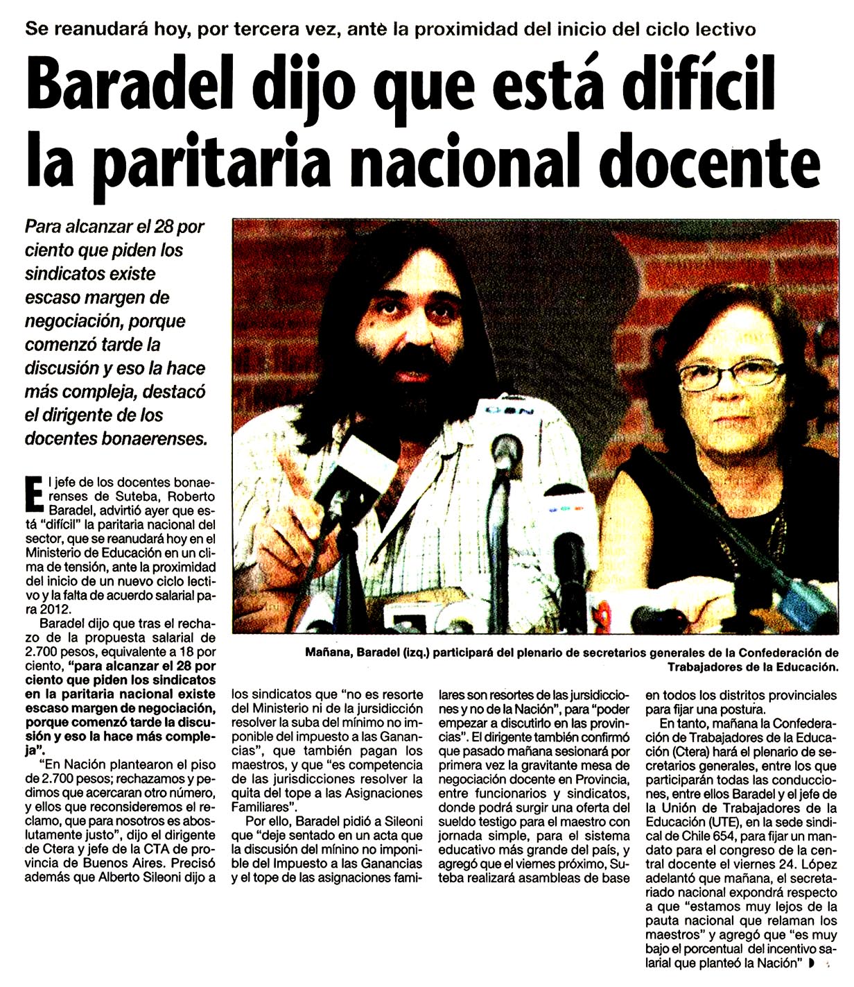 El jefe de los docentes bonaerenses de Suteba, Roberto Baradel, advirtió ayer que está "difícil" la paritaria nacional del sector, que se reanudará hoy en el Ministerio de Educación en un clima de tensión, ante la proximidad del inicio de un nuevo ciclo lectivo y la falta de acuerdo salarial para 2012.