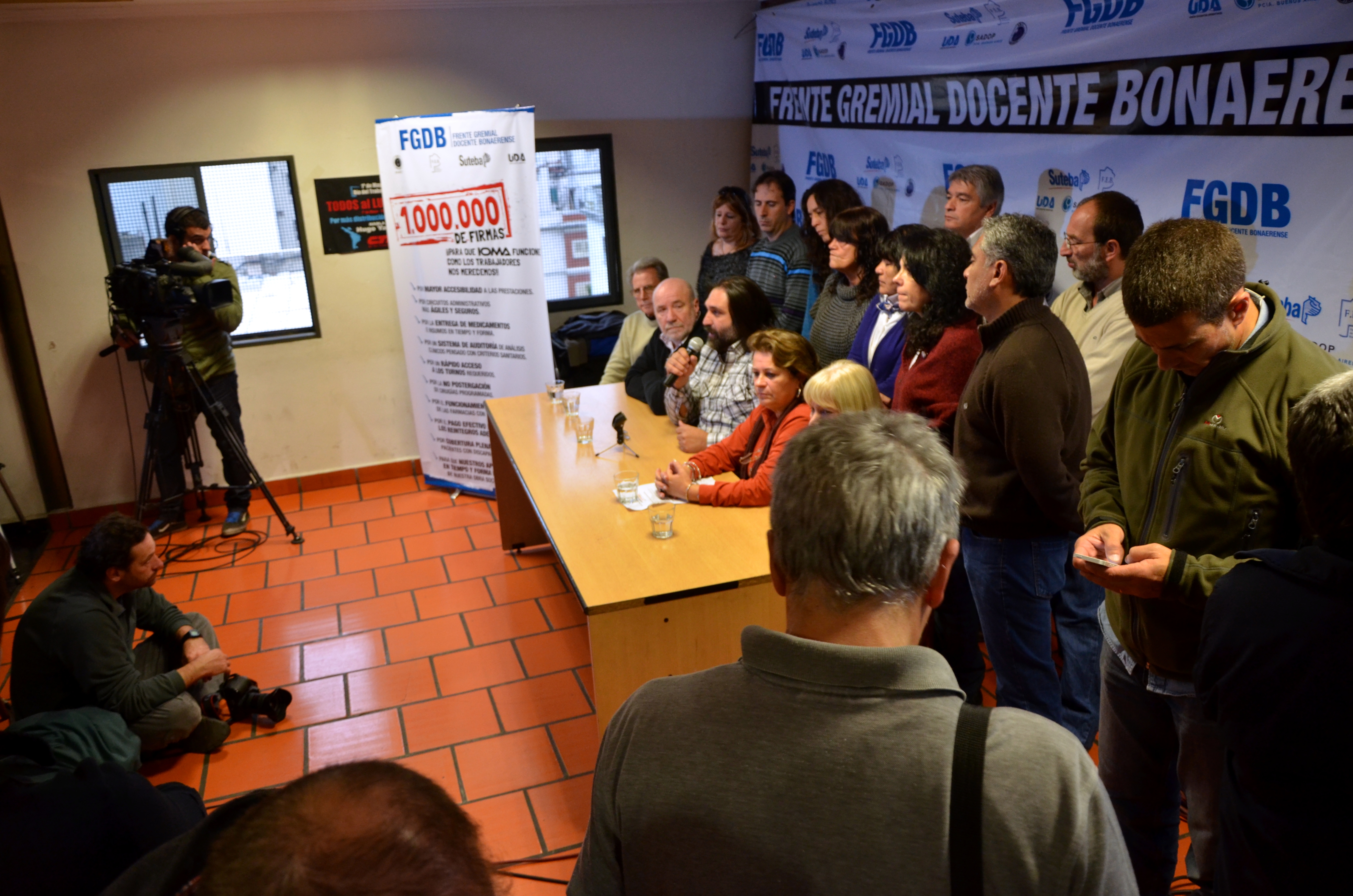 El SUTEBA, en el marco del Frente Gremial Docente Bonaerense (FGDB), realizó una conferencia de prensa al culminar los plazos legales de la Conciliación Obligatoria y para anunciar las acciones a seguir. Además, se planteó la Campaña en defensa del IOMA y se anunció la presentación de un proyecto de Ley en la Legislatura provincial para que las Asignaciones Familiares de los trabajadores estatales de la Provincia tengan carácter universal y no se le apliquen topes.