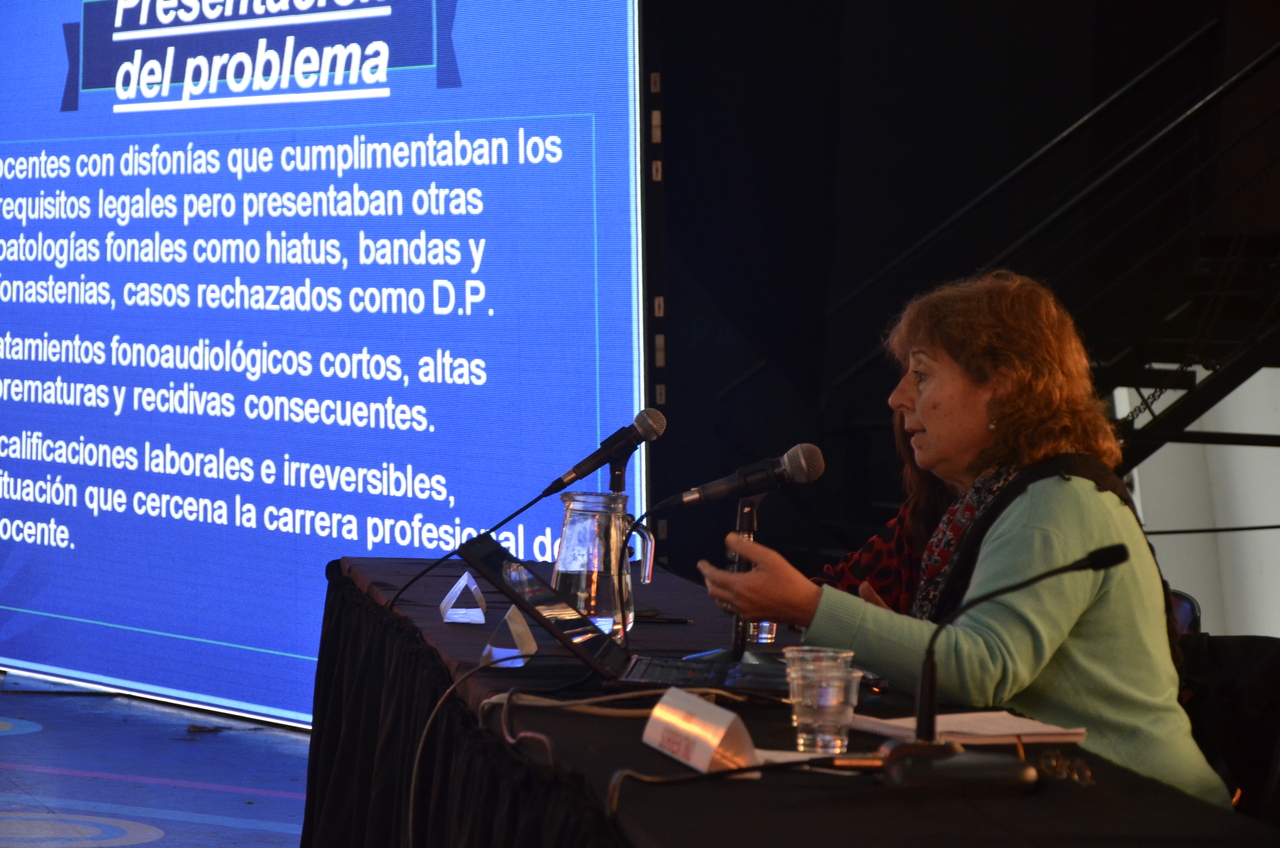 Por último, resaltó todos los logros alcanzados con este trabajo: "Llegamos a las comisiones médicas de la SRT porque hay una serie de patologías (Hiatus, por ejemplo) que no están incluidas en la Ley de Riesgos del Trabajo y que , sin embargo, son precursoras de las alteraciones orgánicas e irreversibles de las cuerdas vocales. Con esta investigación logramos un Acta-Acuerdo, en el 2012, con la inclusión de las mismas. En 2013 logramos la Resolución Nacional N°383, en la que explicita que cuando un docente tiene disfonía, accede al derecho de tener un tratamiento oportuno todas las veces que sea necesario y con la recalificacion de su puesto de trabajo cuando quede establecida su incapacidad. Esta Resolucion abarca a docentes del ambito público y privado del todo el país. Por eso, en esta mesa, la voz de los trabajadores de la educación tenia que estar presentes y desde un lugar importante".