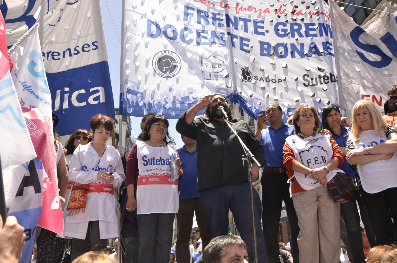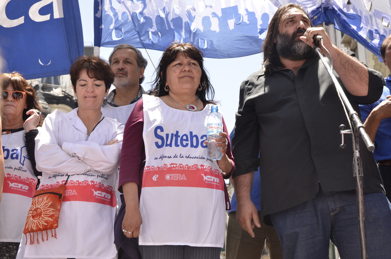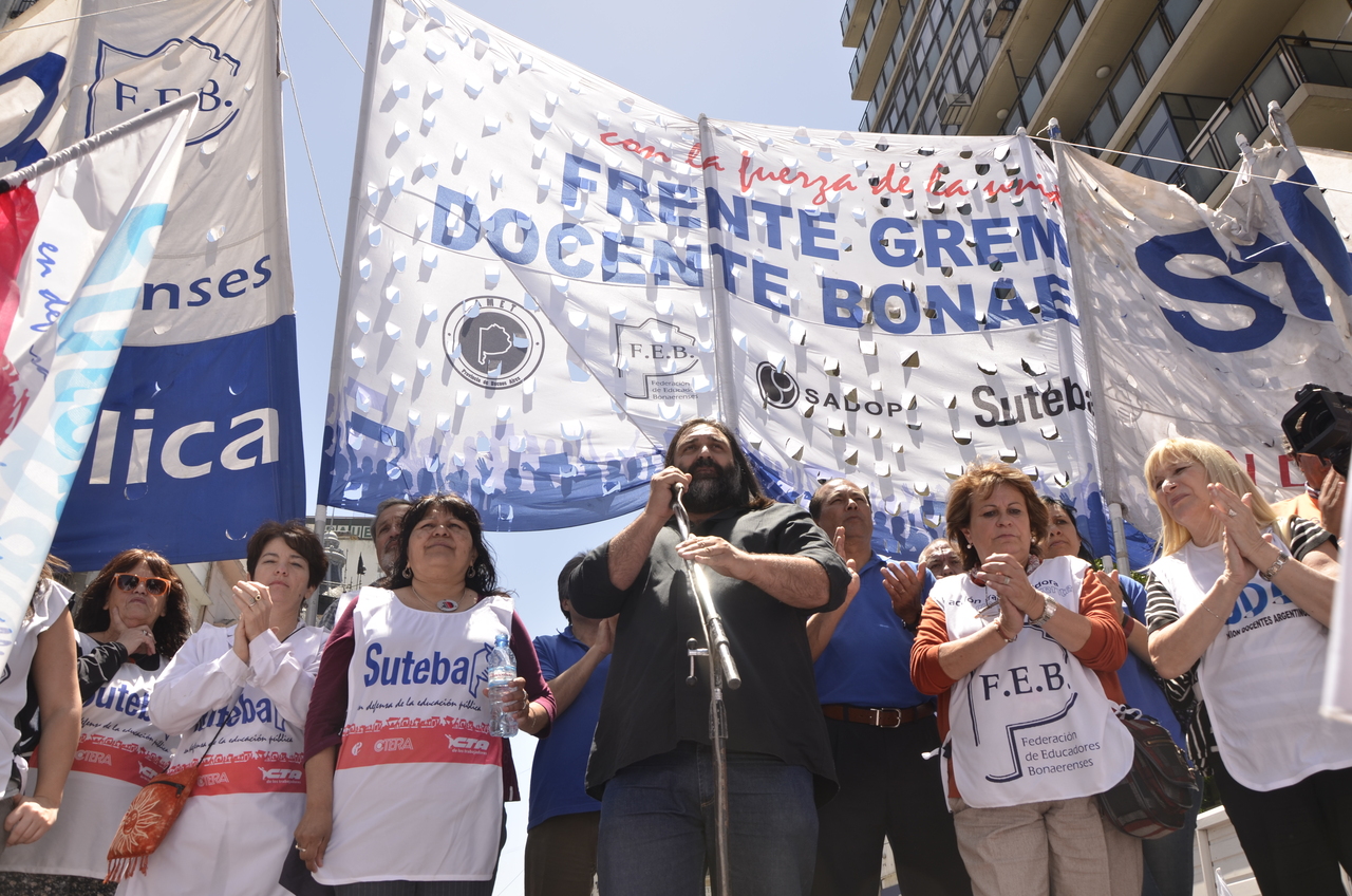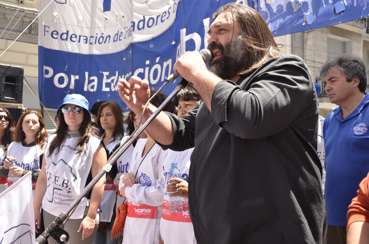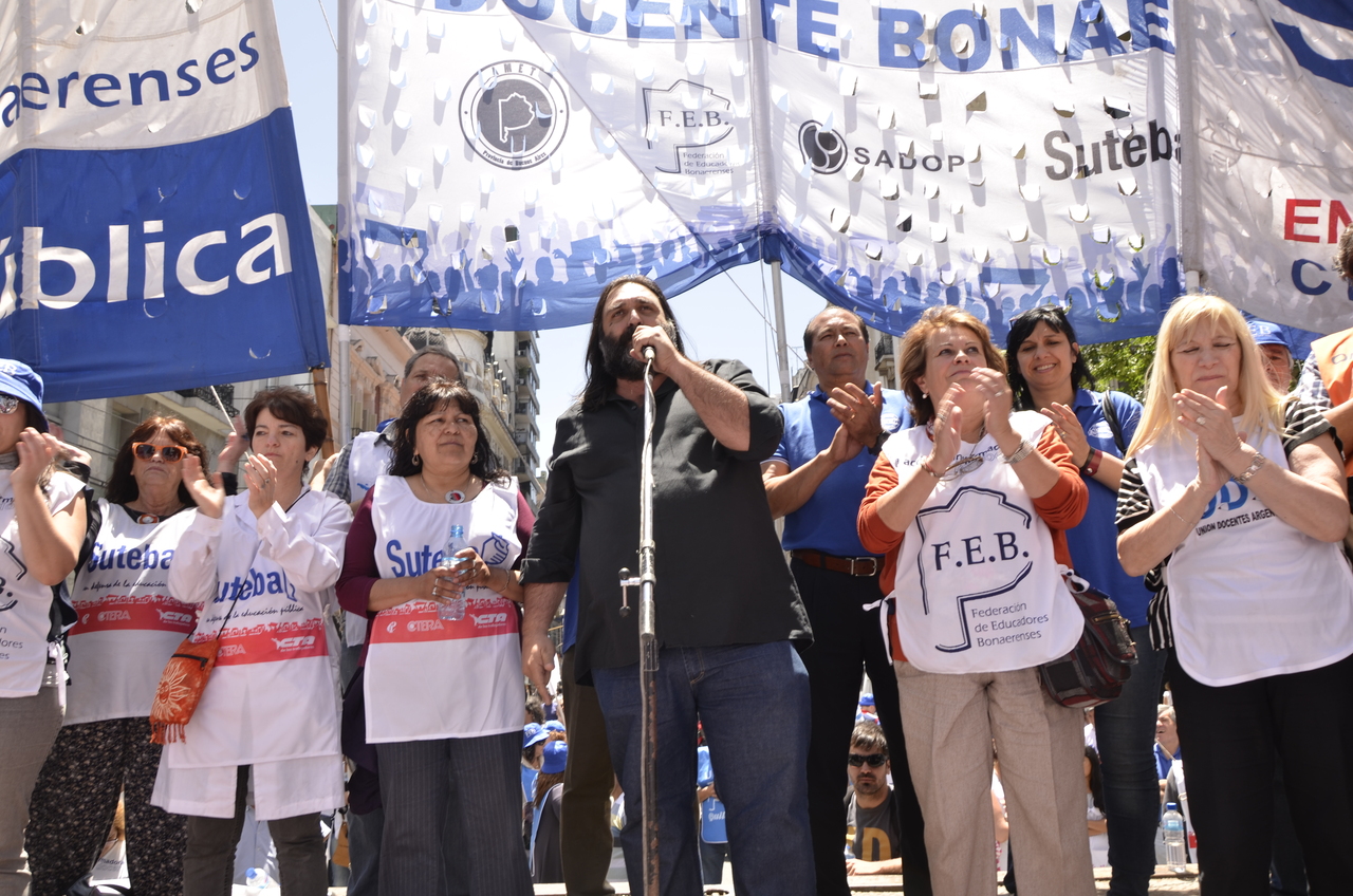 Allí, el Secretario General de SUTEBA, Roberto Baradel, declaró: "Esta movilización de hoy se enmarca en la unidad y en la lucha del Frente Gemial Docente Bonaerense que viene peleando por los derechos de todos los Trabajadores de la Educación desde el conflicto con el aguinaldo del año pasado".