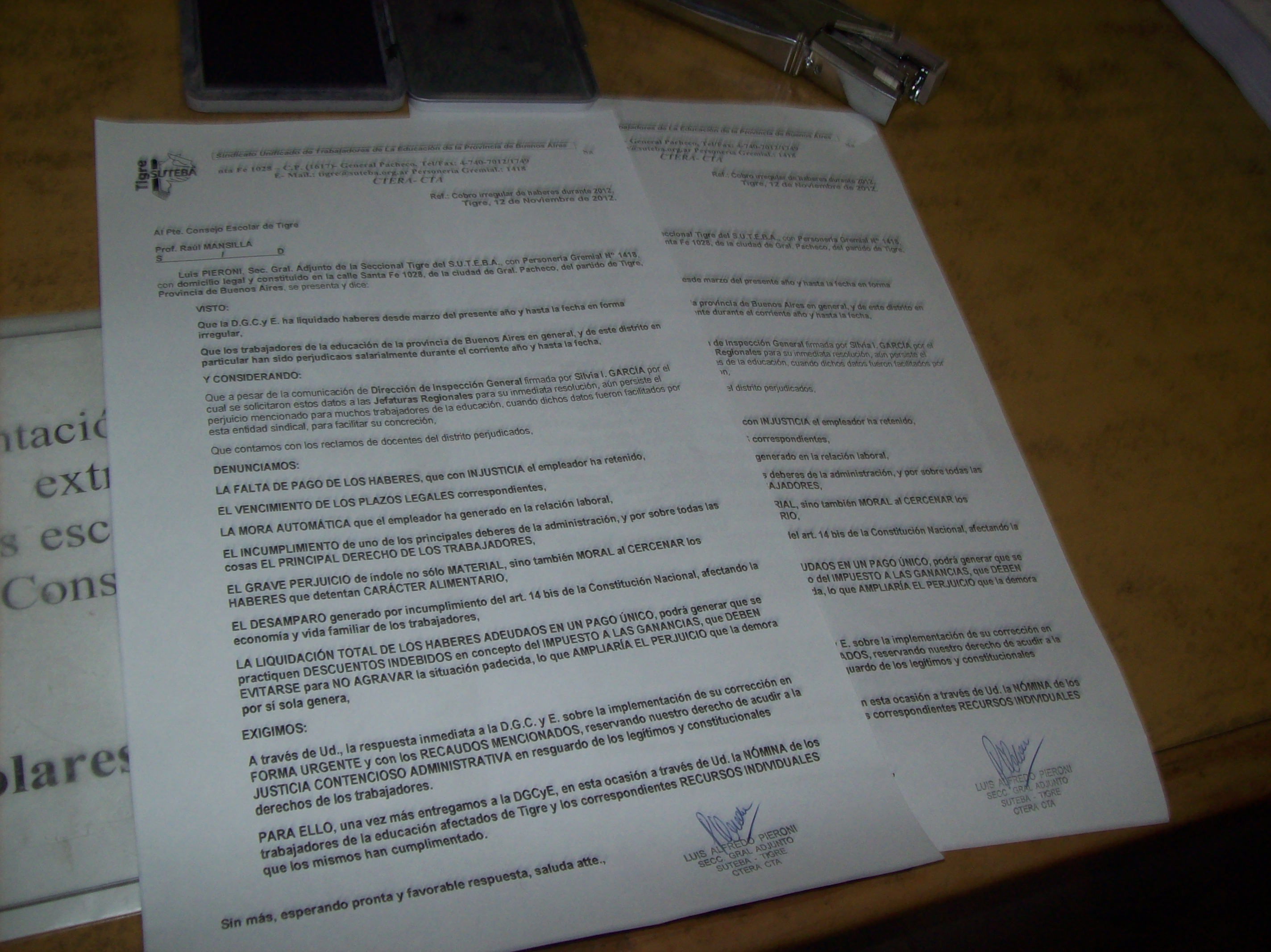 El lunes 12 de noviembre de 2012, realizamos desde la seccional Tigre del SUTEBA, una presentación colectiva y los recursos individuales firmados por 41 compañeros y compañeras afectados por el cobro irregular o la falta de cobro de su salario y que al día de la fecha aún no está resuelto.