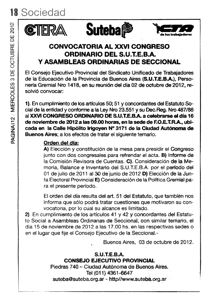 Convocatoria al 26º Congreso Ordinario de SUTEBA y Asamblea General Ordinaria de afiliados de seccionales de SUTEBA , publicada el miércoles 03 de octubre en el diario Página12.
