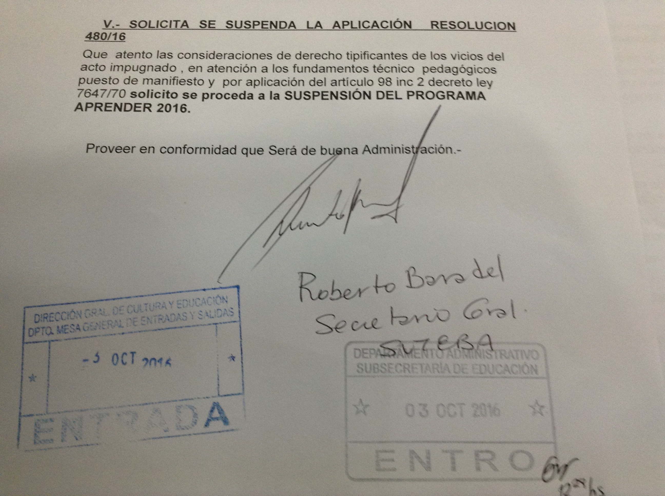 Dado que están presentándose cientos de renuncias de directores y docentes a asumir tareas impuestas de veedores y/o aplicadores del Operativo, la DGCyE está ejerciendo acciones de presión para detenerlas. Ante esta situación, el SUTEBA presentó una impugnación provincial a la implementación del Operativo Nacional de Evaluación "Aprender 2016", interponiendo un recurso de revocatoria y jerárquico en subsidio contra la Resolución 480/16.