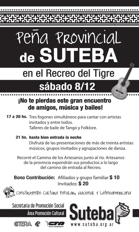 | Peña Provincial: Sábado 8/12 en el Recreo del Tigre: Desde las 17:00 hasta bien entrada la noche. Sumate a la ronda! Vienen conjuntos de toda la Provincia. Habrá baile, asado, mateadas y muchas sorpresas más!