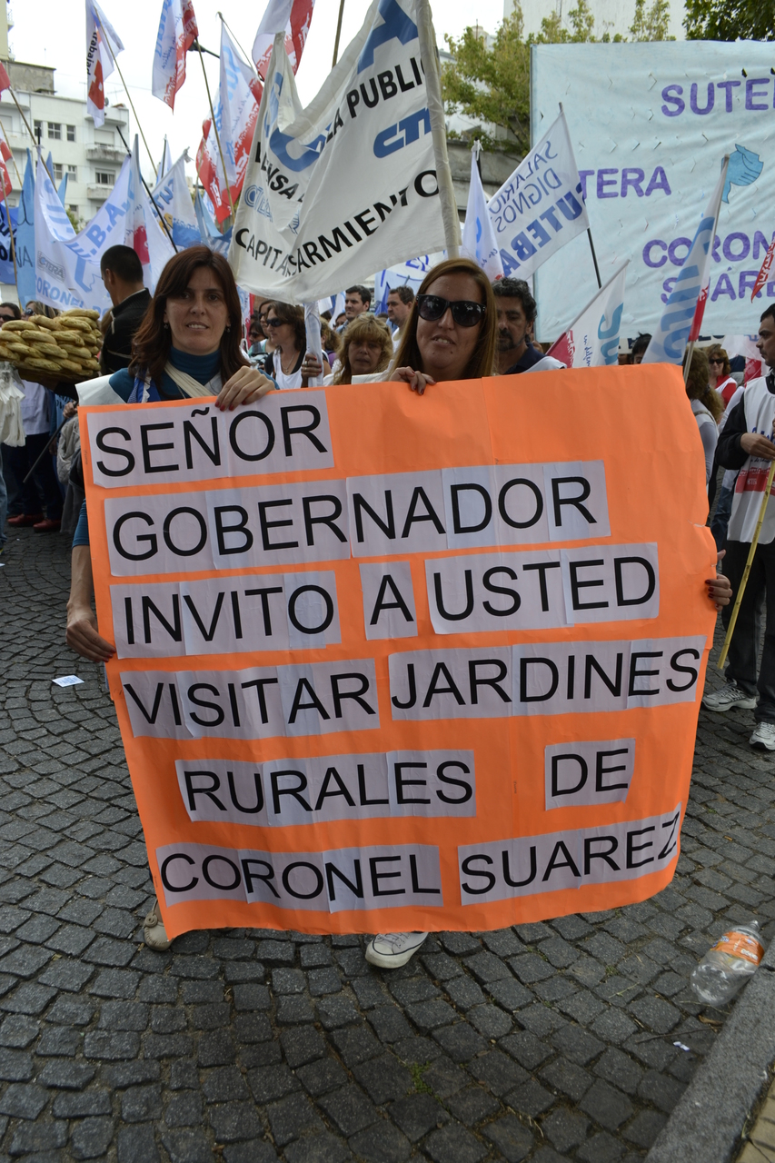 En ese sentido señaló varias de las demandas que deben ser solucionadas: "Que paguen las Asignaciones Familiares en tiempo y forma, que aumenten la inversión en infraestructura en toda la Provincia de Buenos Aires, que le paguen en tiempo y forma a los docentes y no les hagan descuentos indebidos, que resuelvan la situación del IOMA para que funcione bien, tienen que descongelar los cargos docentes y nombrar bibliotecarios, preceptores, equipos de orientación escolar, profesores de educación física, de artística, personal jerárquico, y muchos más. También tienen que garantizar los comedores escolares y no cortarles los servicios, así como también el transporte, el gas y el mobiliario en las escuelas."