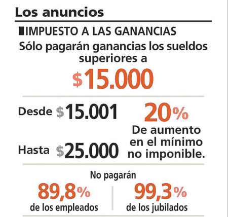 Es de destacar que el financiamiento de esta medida provendrá de recursos estatales y de la aplicación de una ley de gravamen a algunas transacciones financieras que se enviará al congreso la semana que viene. La medida tiene un costo fiscal anualizado de 12.000 millones de pesos. Sólo un 10% de asalariados de altos ingresos pagará ganancias.