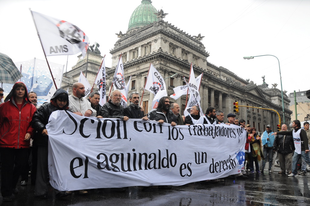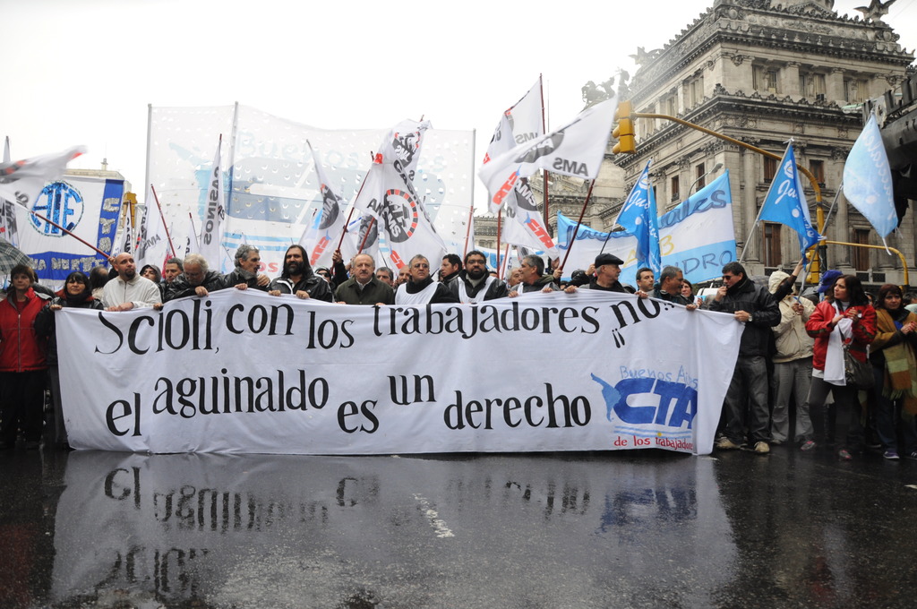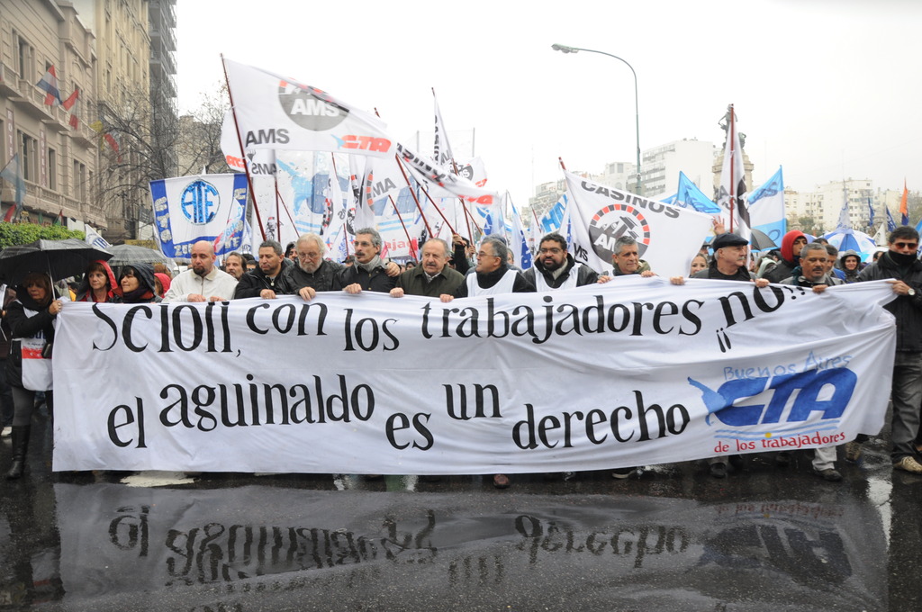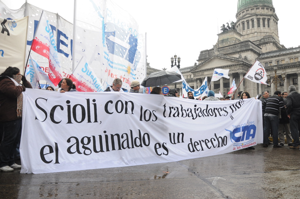 Luego, el dirigente declaró: “Exigimos que el gobierno vuelva atrás y pague el aguinaldo completo” y agregó: “Venimos a reclamar nuestro aguinaldo, pero no vamos a permitir que toquen nuestro salario.”
