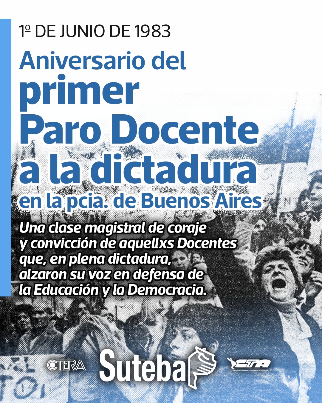 En esta fecha, las Uniones de Educadores de La Matanza y Morón, que luego se unificarían en SUTEBA junto a muchos otros distritos, realizaron el primer paro a la dictadura en territorio bonaerense.