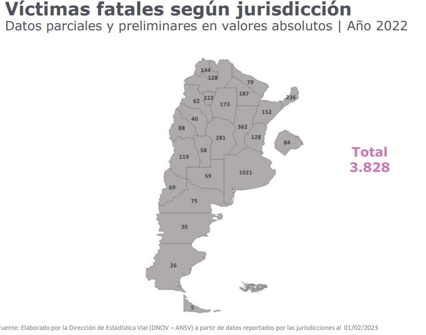 Los datos preliminares del Observatorio Vial de la Agencia Nacional de Seguridad Vial indican que en el 2022 se registraron en todo el país 3415 siniestros fatales, con un total de víctimas fatales de 3828 fallecidxs, (decesos en el momento del accidente). Esto representa un promedio de 9,4 siniestros fatales por día con un promedio de 10,5 fallecimientos por día por esta causa. Del total de lxs fallecidxs del último año, poco más de mil corresponden a incidentes ocurridos en la provincia de Buenos Aires.