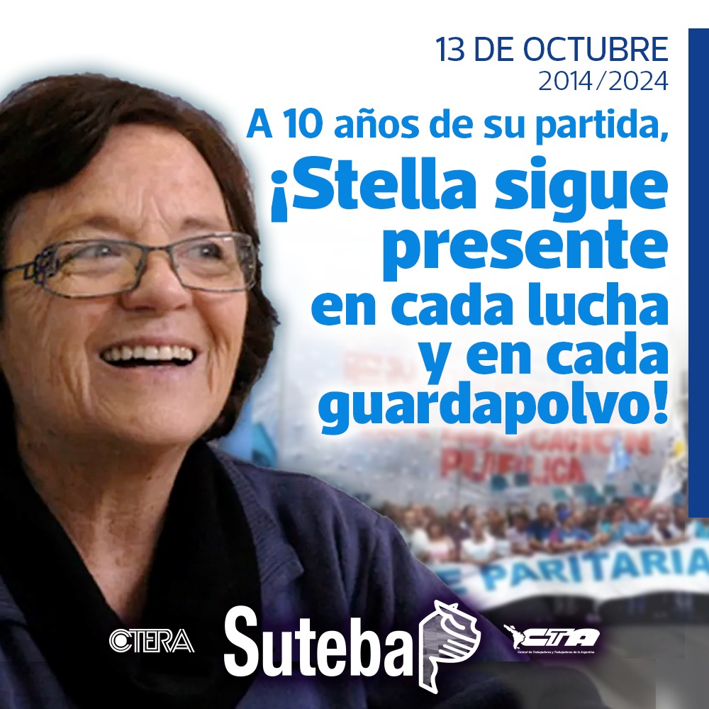 El 13 de octubre del 2014 nos dejaba, solo en el plano terrenal porque continúa junto a nosotros, nuestra querida e inolvidable compañera Stella Maldonado, por entonces Secretaria General de la CTERA. Su partida nos causó mucho dolor, pero ella se convirtió en bandera de todo lo que anhelamos, de todos los sueños que nos quedan cumplir para alcanzar una Educación Pública que incluya a todas las pibas y todos los pibes y les dé un futuro mejor. Su amor hoy es nuestro motor y desde nuestro lugar, militando, en las calles, en cada batalla, en cada pelea, en cada conquista, le rendimos un merecido homenaje por todo lo que nos dio y nos compartió.