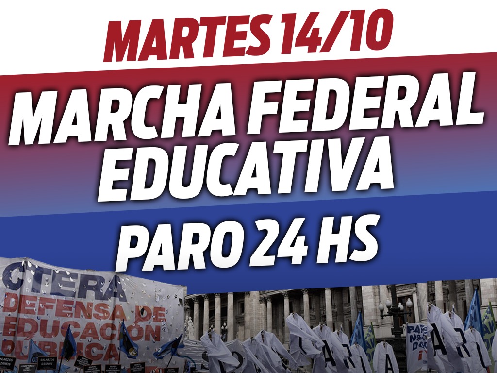 Desde la CTERA, nuestra Confederación nacional, convocamos a un Paro Nacional de 24 hs y a una Marcha Federal Educativa este martes 14 de octubre para denunciar el ajuste y el desfinanciamiento del Gobierno Nacional en la Educación Pública.