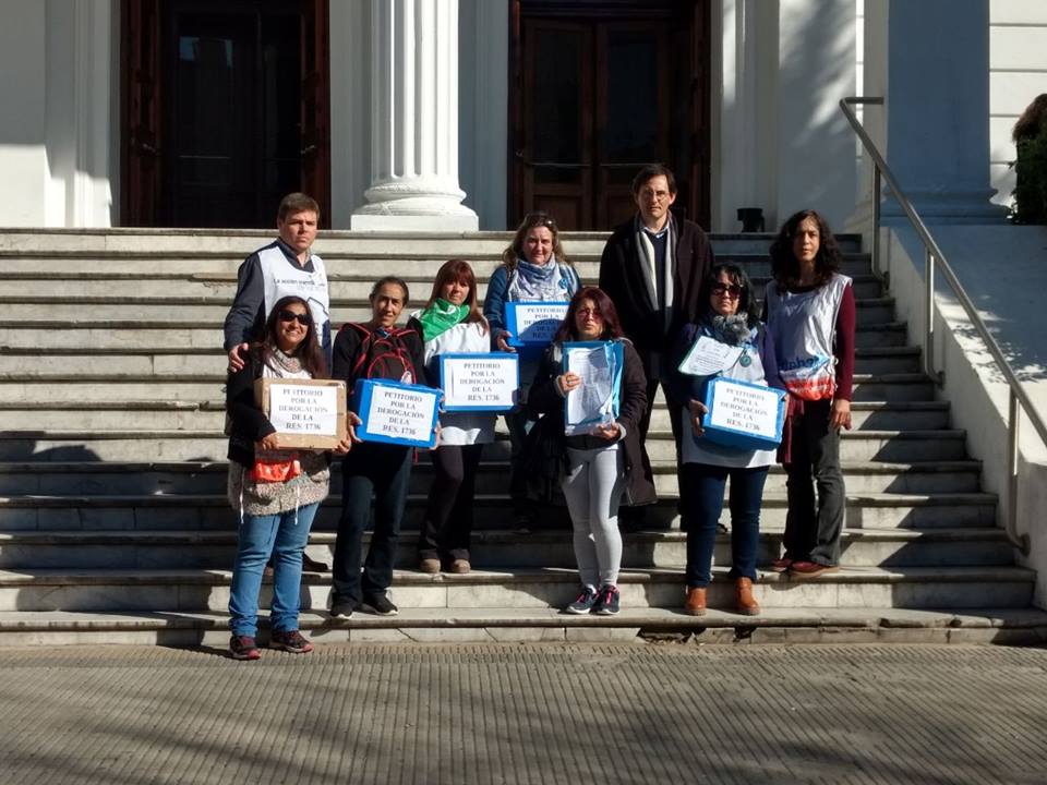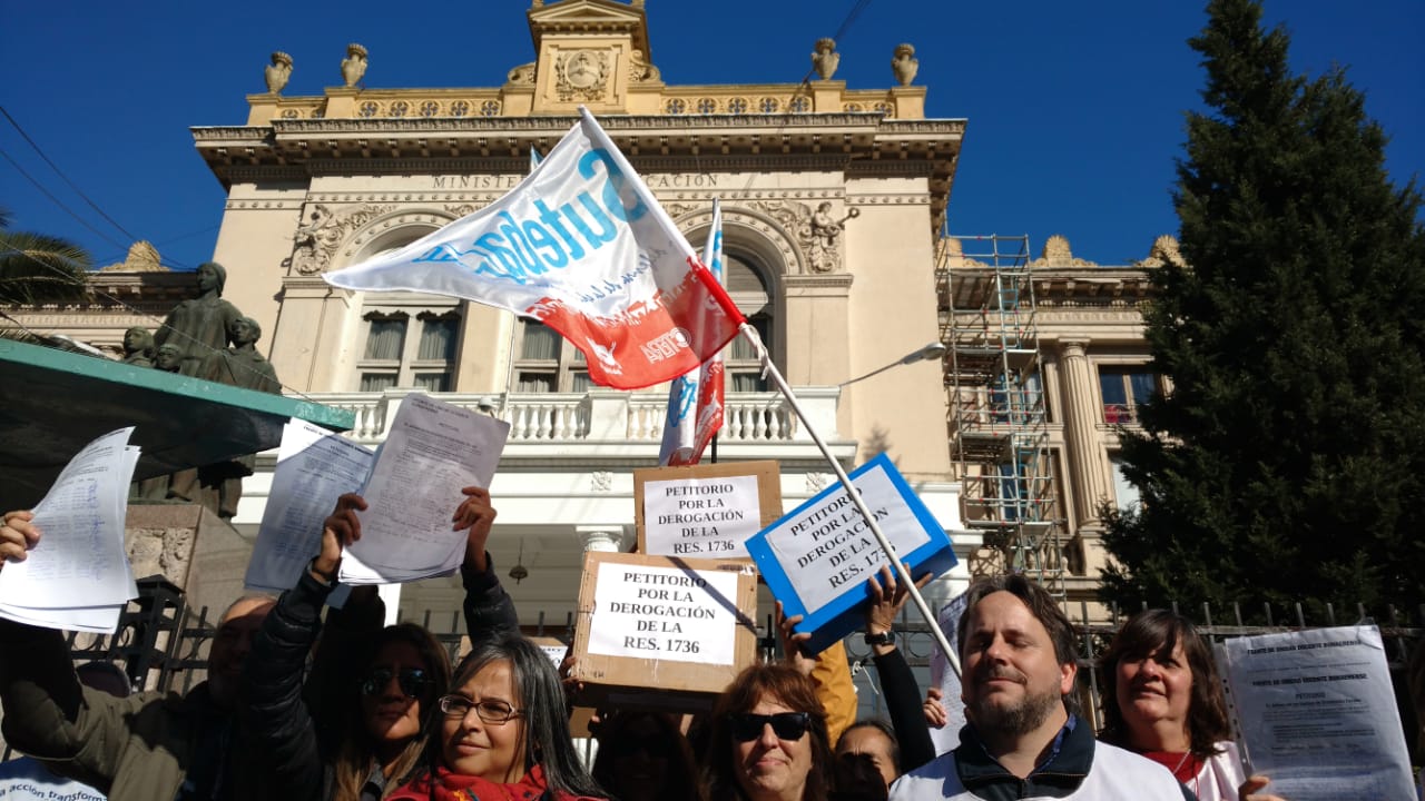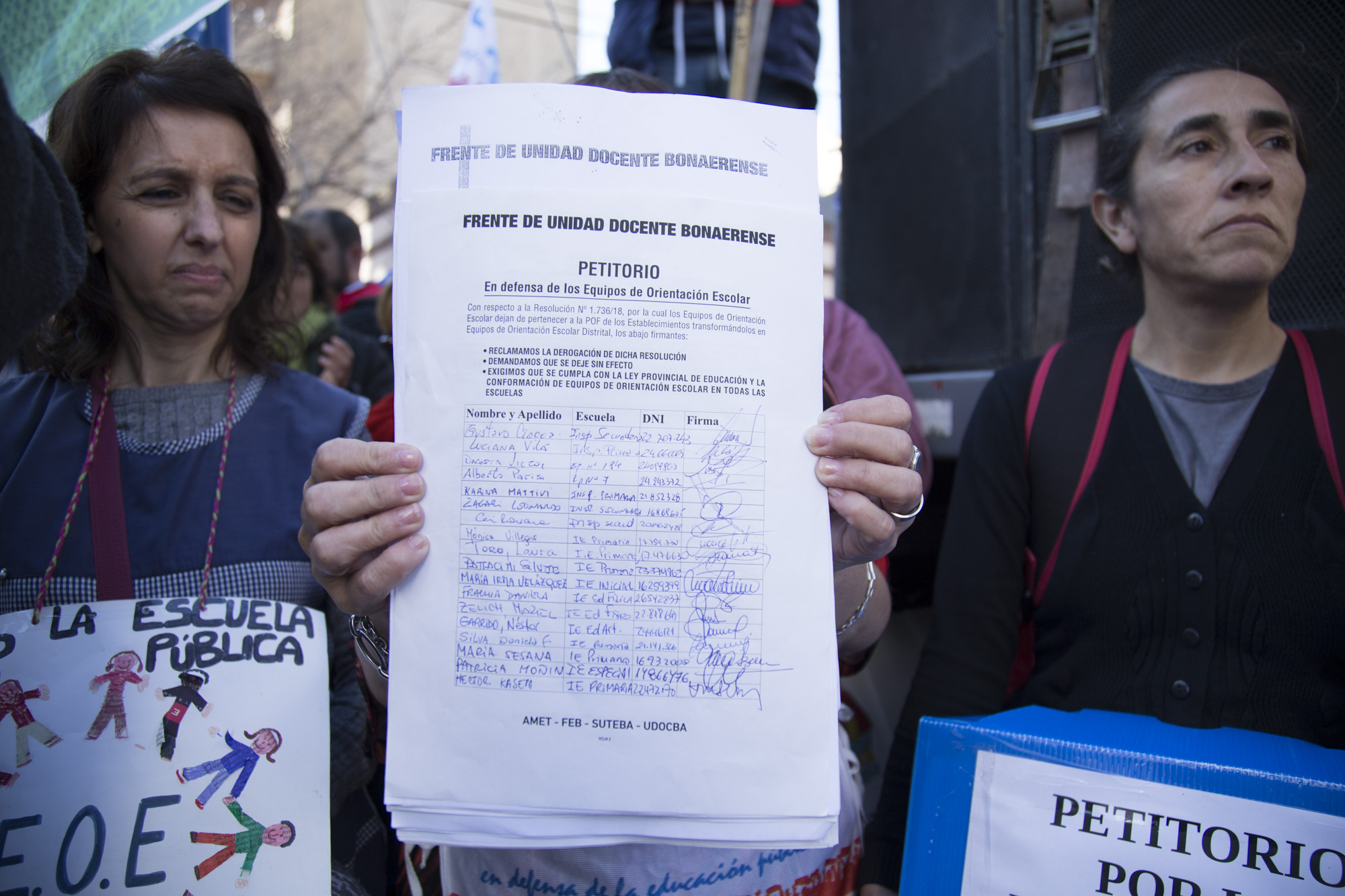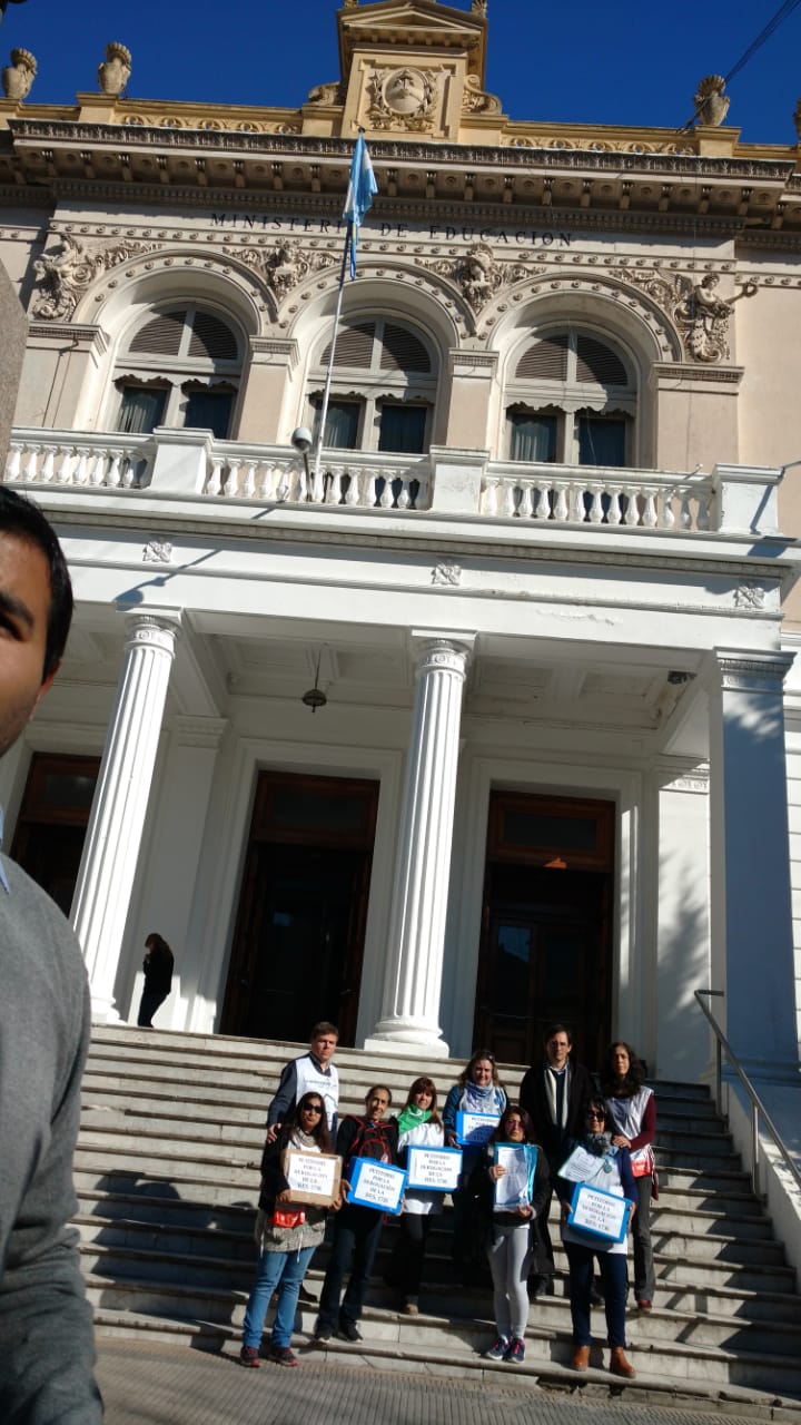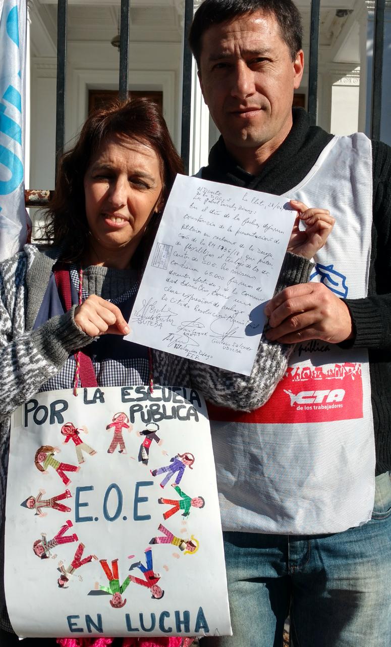 El jueves 28, lxs representantes de los Sindicatos Docentes del FUDB (AMET, FEB, SUTEBA, UDOCBA), quienes al principio permanecieron fuera de la DGCyE debido a que las puertas estaban cerradas y no se permitía el acceso, pudieron hacer entrega de los petitorios firmados por la comunidad educativa en rechazo a la Resolución Nº 1736/18 y a la flexibilización laboral de los EOE.