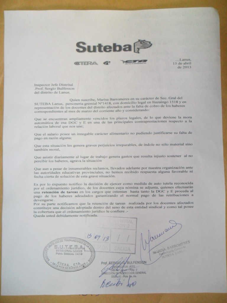15/4 ACCIONES SUTEBA LANÚS POR EL NO COBRO DE COMPAÑEROS