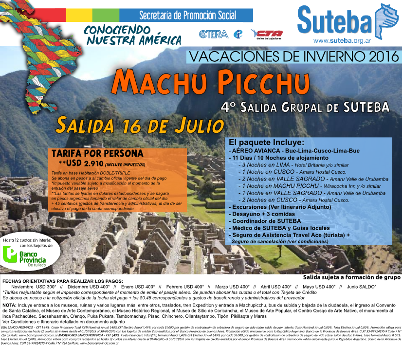 Para las vacaciones de invierno 2016, el SUTEBA organiza un gran viaje, en el marco de su Escuela de Montaña: un recorrido por el Camino del Inca, que incluye la visita al Machu Picchu, en Perú. Los compañeros que deseen sumarse deben haber participado antes en las actividades de la Escuela, o acreditar experiencia similar en actividades de montaña, ya que se trata de un circuito de alta exigencia física.