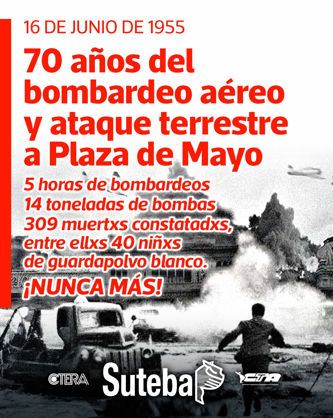 El bombardeo se inicia el mediodía del 16 de junio. La acción intensa se prolonga por varias horas dejando en la Plaza de Mayo un escenario dantesco. Decenas de civiles que concurrían a sus trabajos son destrozados por el fuego y las esquirlas. La CGT convoca a los Trabajadores a defender el Gobierno popular y después del mediodía cientos de personas llegan para ayudar a los caídos, algunos armados, otros con palos dispuestos a pelear. A las 15:30 hs de esa tarde aparece otra escuadrilla que lanzó una seguidilla de bombas y barrió la Avenida de Mayo con sus ametralladoras. El golpe fue sofocado, pero quedaron en la Plaza centenares de muertos y un millar de heridos.