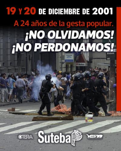 El Presidente De la Rúa anunció por cadena nacional que había decretado el Estado de Sitio por 30 días en todo el país. Ese discurso jugó como detonante de un estallido y en el anochecer del 19, luego de escuchar al Presidente una multitud, fundamentalmente de los barrios de Capital, llenó la Plaza de Mayo con el cántico contundente "Que se vayan todos, que no quede ni uno solo", consigna que se generalizó y daba cuenta de la crisis de representación política que se vivía. Hubo represión.