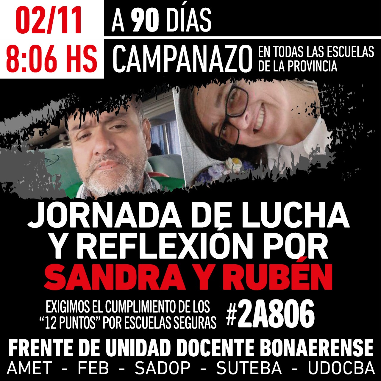 Mañana, viernes 2 de noviembre, a 90 días de las muertes de nuestrxs compañerxs Sandra y Rubén, causadas por la desidia y el abandono del Gobierno Provincial, realizaremos una jornada de lucha y reflexión en todas las Escuelas de la Provincia.