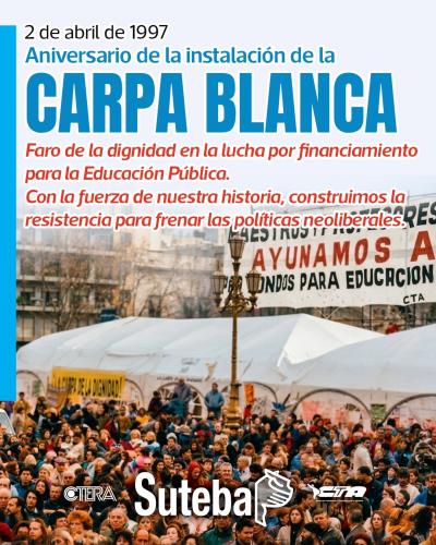 Desde 1997, las acciones del SUTEBA se centraron en la lucha que la CTERA emprendió por una Ley de Financiamiento Educativo en contra de las políticas neoliberales. La iniciativa, que posibilitó la nacionalización del conflicto, fue la instalación de la Carpa Blanca frente al Congreso y el inicio del ayuno docente por parte de unxs cincuenta Maestrxs, el 2 de abril de 1997, que duró 1003 días.