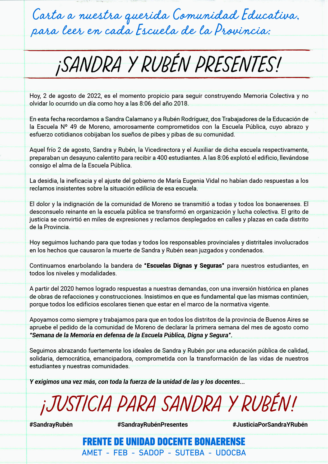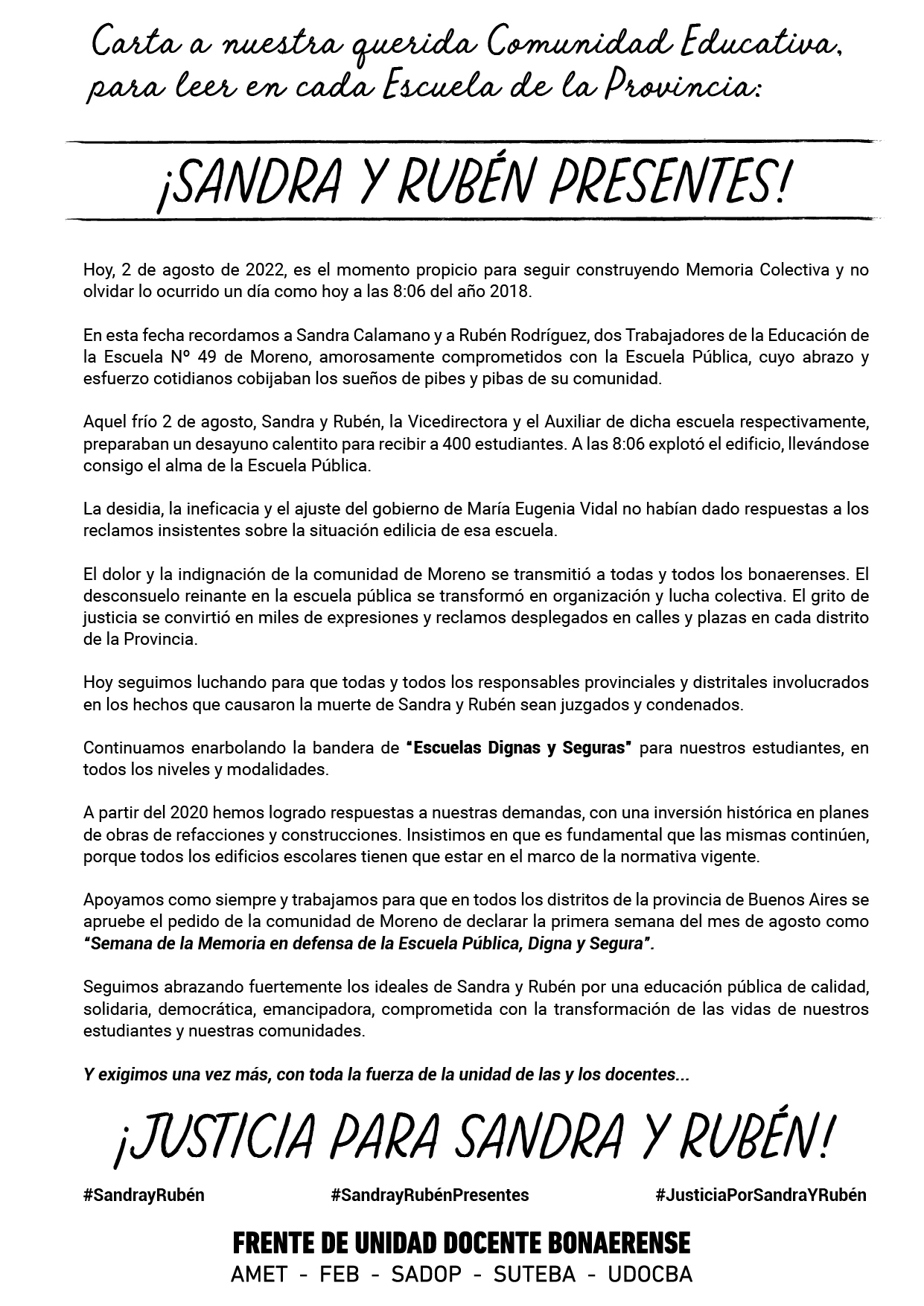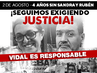 El 2 de agosto de 2018, la desidia del Gobierno de Vidal les arrancó la vida a Sandra y a Rubén cuando se disponían a abrir las puertas de la Escuela Nº 49 de Moreno para recibir a lxs Alumnxs.
