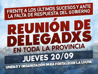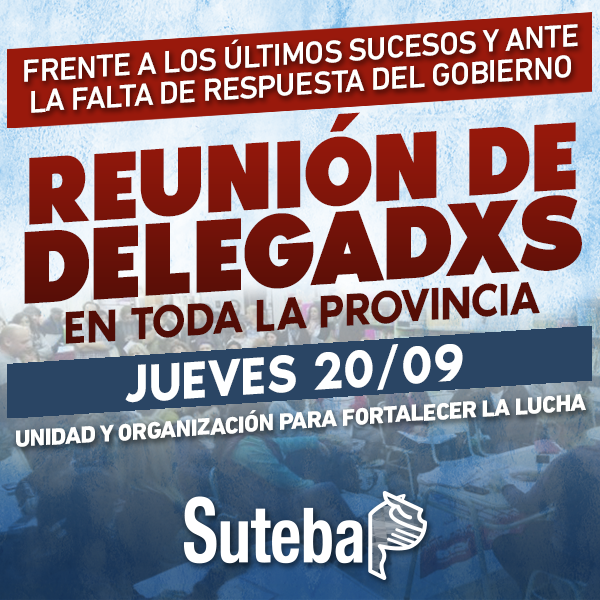 Frente a los últimos sucesos, que preocupan y alertan a lxs Trabajadorxs de la Educación y a toda la comunidad educativa, SUTEBA convoca a reunión de Delegadxs en toda la Provincia el jueves 20 de septiembre, para organizar y profundizar las acciones hacia el Paro y la movilización de la CTA de lxs Trabajadorxs junto a las otras centrales.