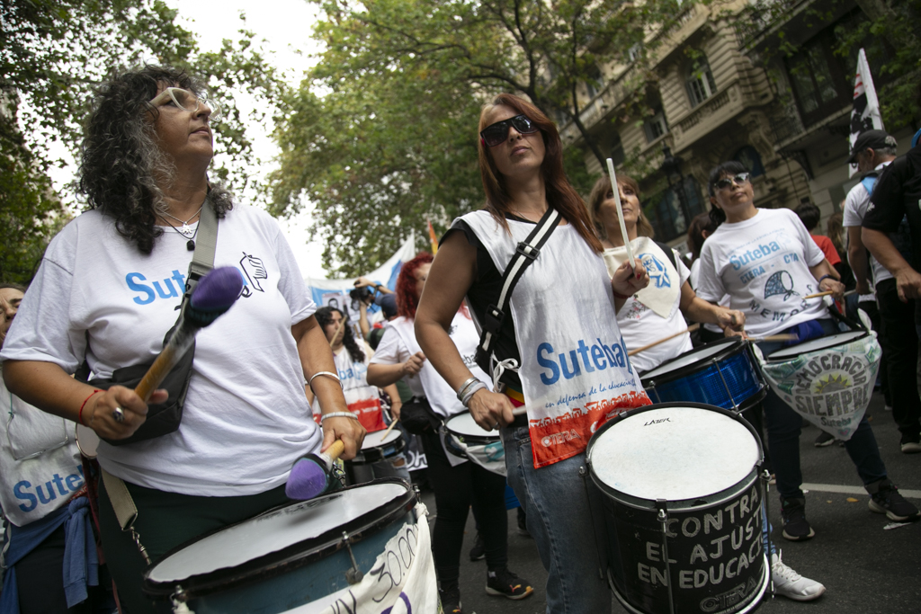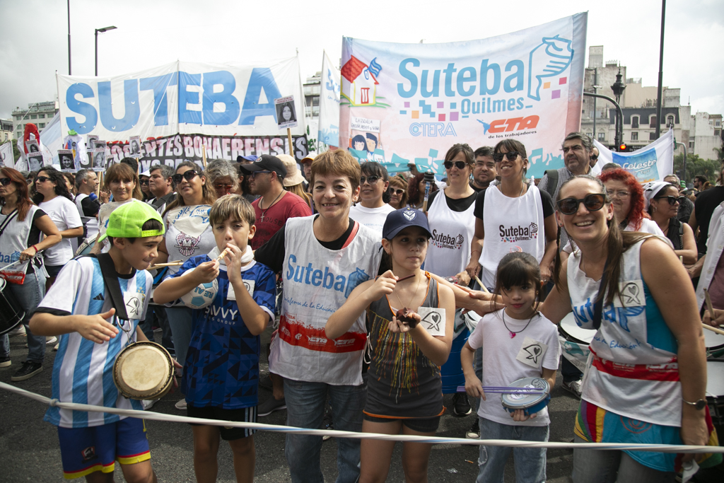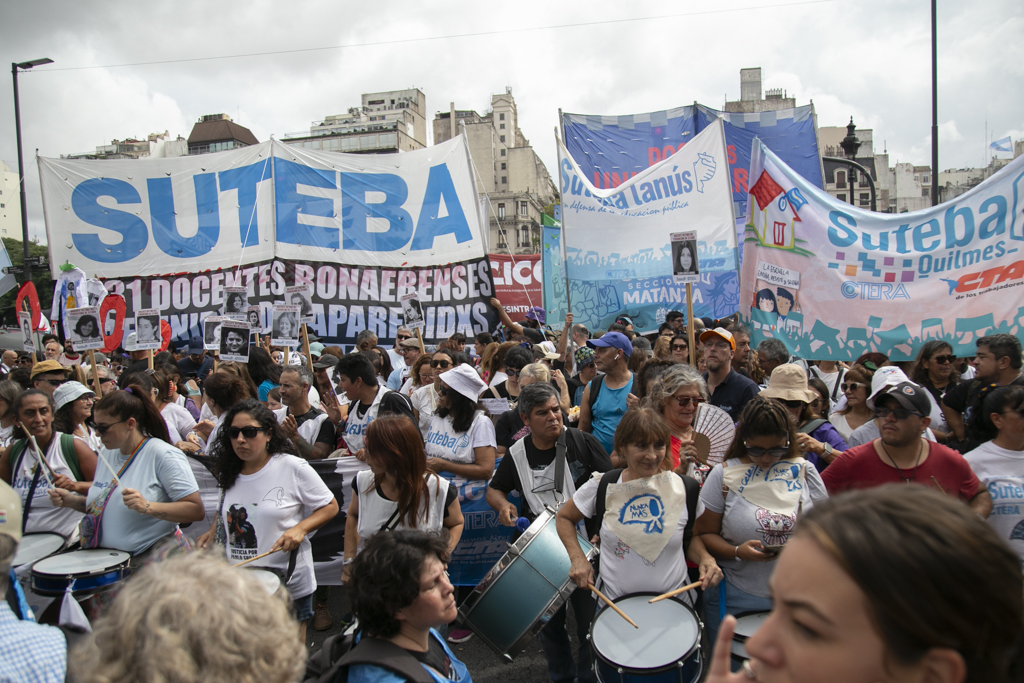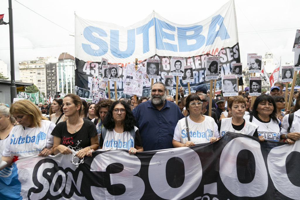 Roberto Baradel, Secretario General del SUTEBA, manifestó durante la jornada: "Estamos marchando por lxs 30.000, porque son 30.000; en particular por lxs 431 Docentes de la provincia de Buenos Aires detenidxs desaparecidxs y más de 800 a nivel nacional. Venimos a denunciar que este no solamente es un Gobierno negacionista, sino que es pro dictadura militar, porque lleva las mismas políticas. Lo único que no pueden hacer es desaparecer personas por los anticuerpos democráticos, pero las movilizaciones a cargo de Patricia Bullrich van directamente en línea con la dictadura cívico militar. Estamos muy contentxs con que se esté recuperando Pablo Grillo, pero le tiraron a matar, hay que decirlo así con todas las letras; y eso es un Estado represivo".