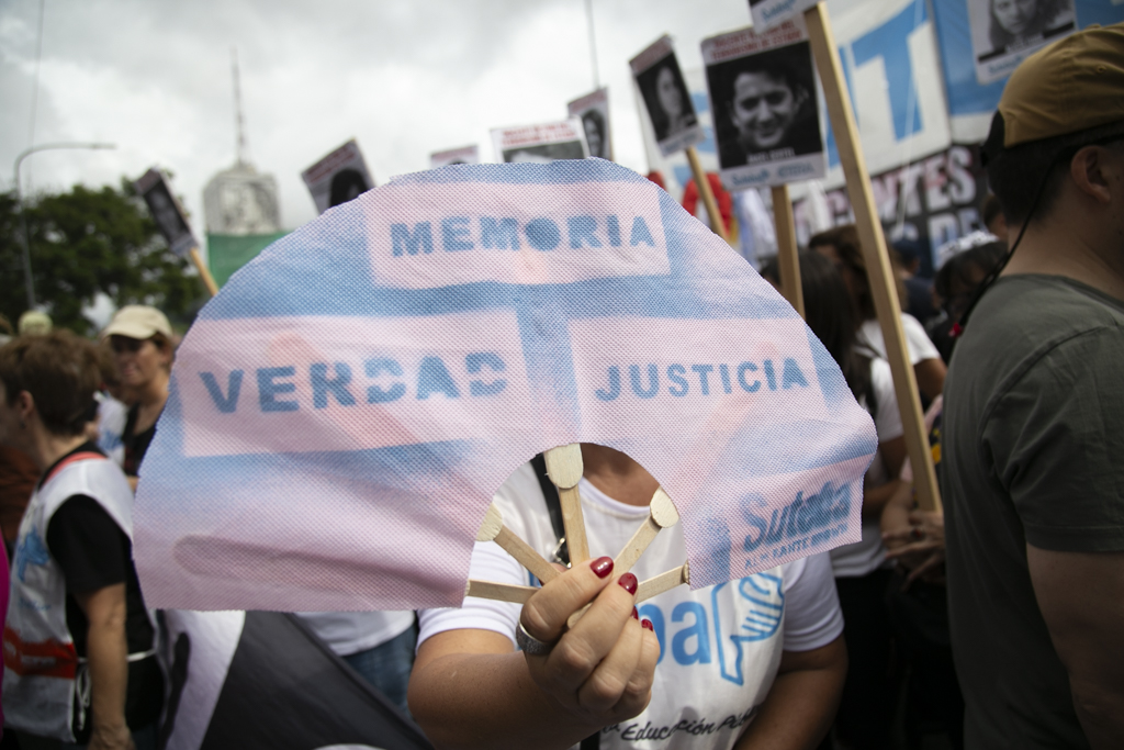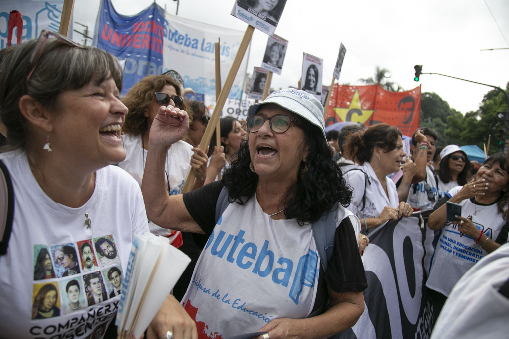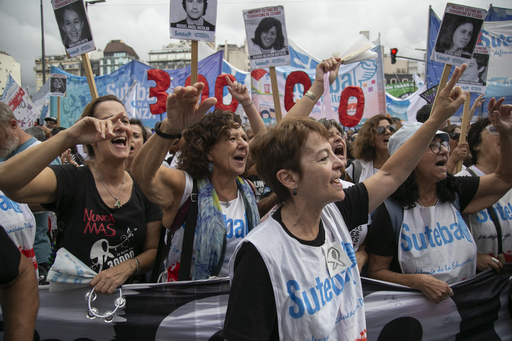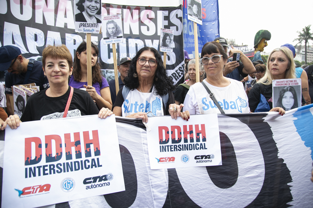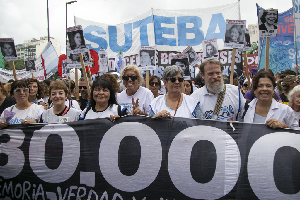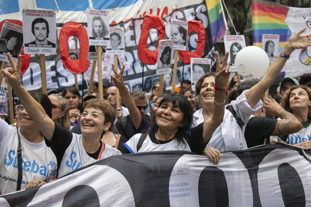 La Secretaria General Adjunta del SUTEBA, Silvia Almazán, reflexionó: "Haber construido esta marcha en unidad con todos los movimientos sociales, organismos de DDHH, políticos y sindicales es histórico y eso significa también el consenso que hay en nuestro Pueblo de seguir sosteniendo las banderas de Memoria, Verdad y Justicia. Vamos a seguir dando batalla a un discurso negacionista en un contexto de brutal ajuste y represión. No nos van a silenciar. Acá está la posición, el cuerpo y las convicciones de nuestro Pueblo".