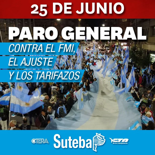 SUTEBA, junto a CTERA y CTA, se suma al Paro Nacional convocado por todas las centrales sindicales para el 25 de junio.