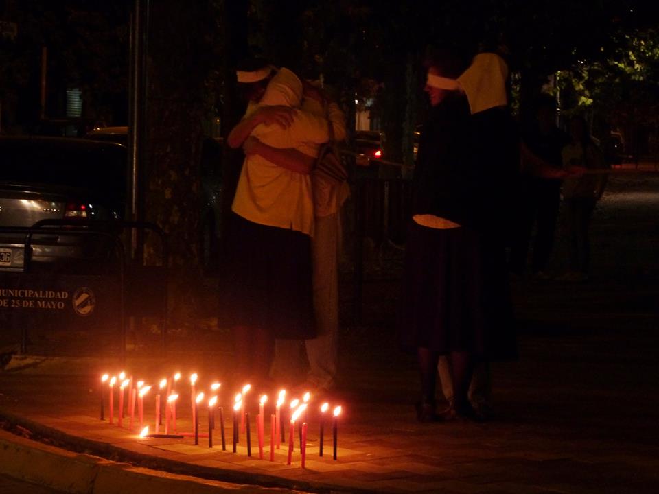 El acto comenzó con dos madres que caminaron hacia la plaza, para luego encender 39 velas y retirarse. En ese mismo momento, hace su ingreso un policía que tiene a dos jóvenes vendados y atados. El personaje del policía los ataca, los maltrata y también se va.