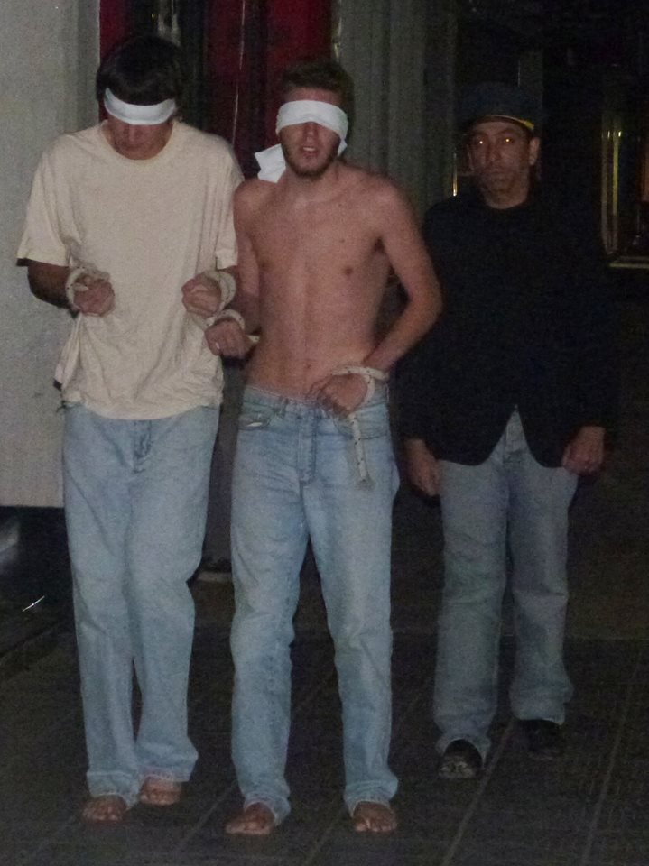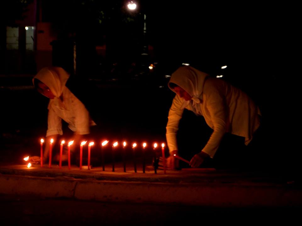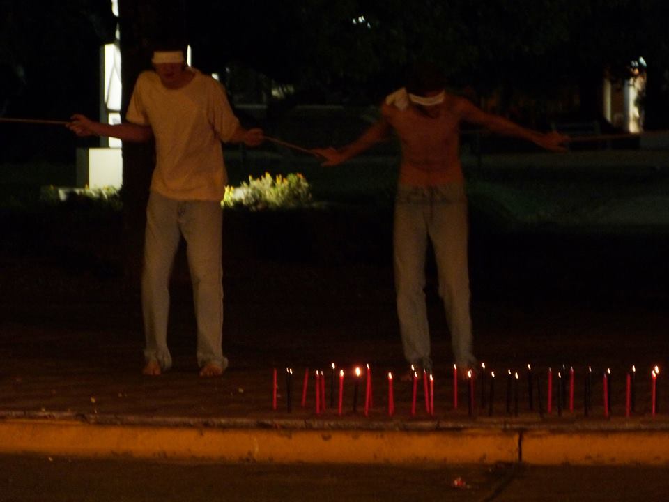 El acto comenzó con dos madres que caminaron hacia la plaza, para luego encender 39 velas y retirarse. En ese mismo momento, hace su ingreso un policía que tiene a dos jóvenes vendados y atados. El personaje del policía los ataca, los maltrata y también se va.