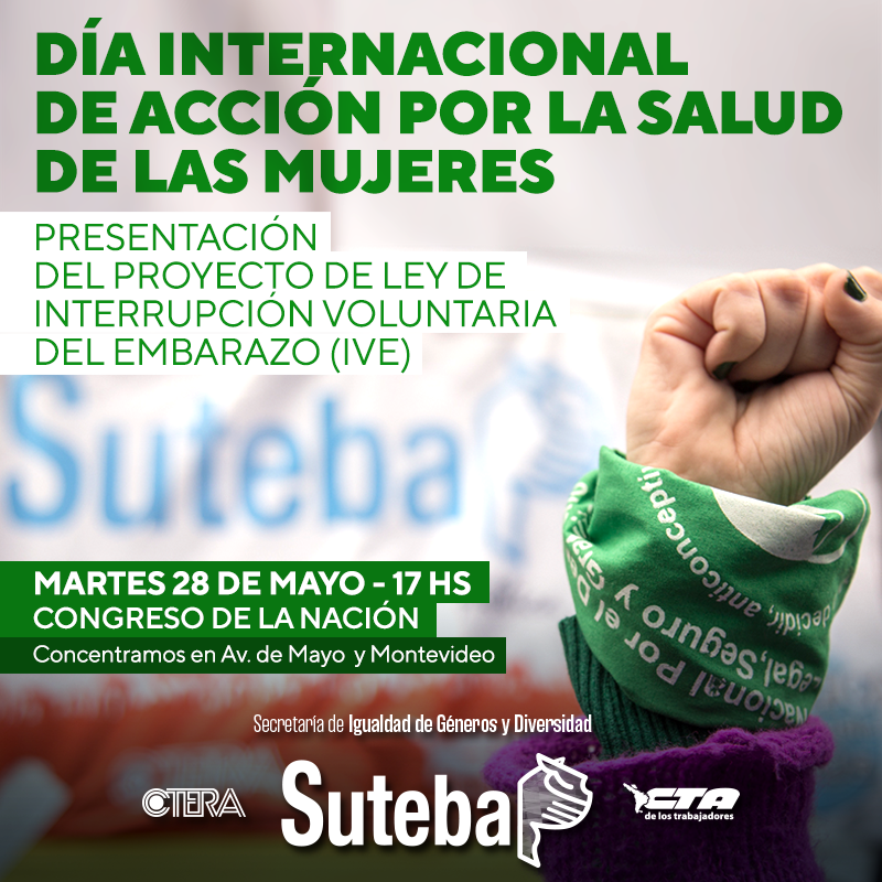 El martes 28 de mayo, el SUTEBA estará presente en el Congreso para acompañar la presentación del proyecto de Ley de Interrupción Voluntaria de Embarazo (IVE), elaborado por la Campaña Nacional por el Aborto Seguro Legal y Gratuito.